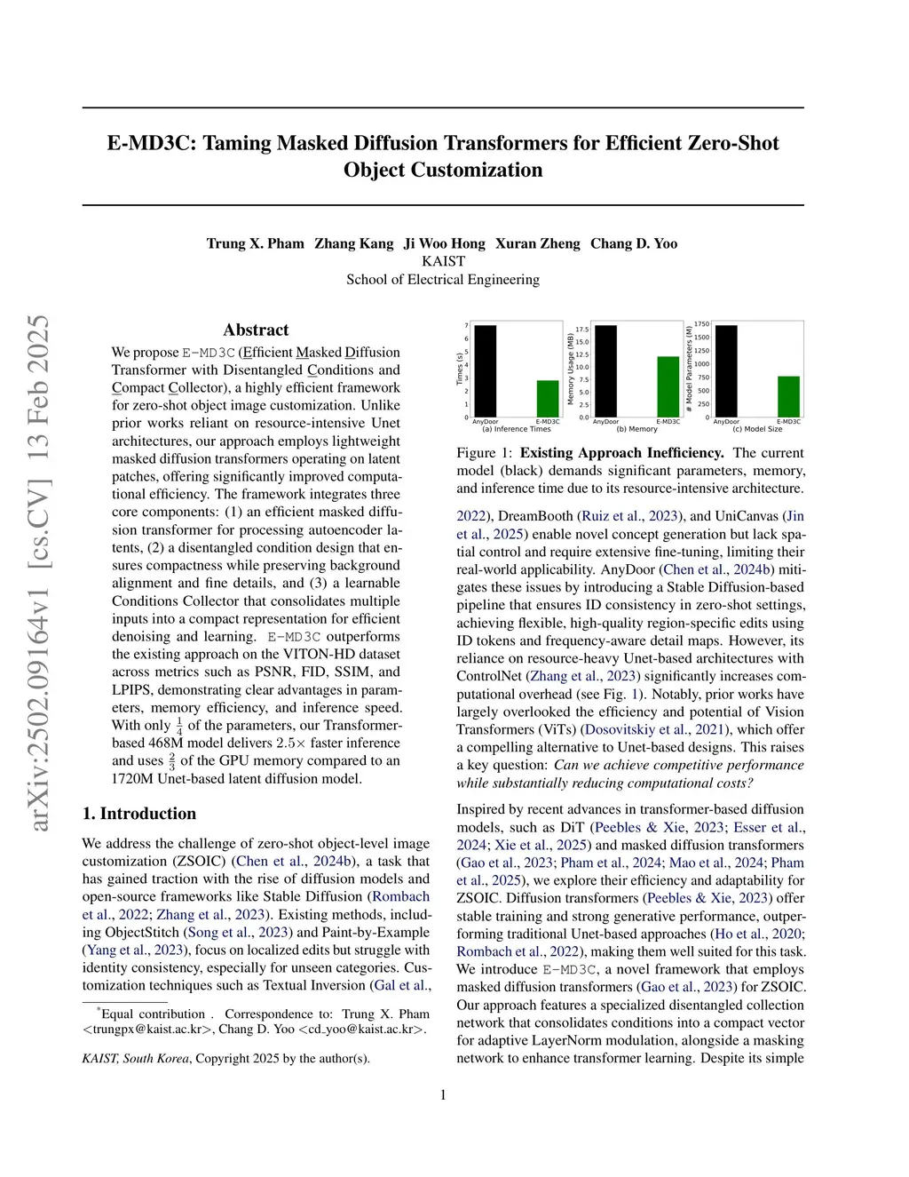 We propose E-MD3C (fficient asked iffusion Transformer with Disentangled onditions and ompact ollector), a highly efficient framework for zero-shot object image customization. Unlike prior works reliant on resource-intensive Unet architectures, our approach employs lightweight masked diffusion transformers operating on latent patches, offering significantly improved computational efficiency. The framework integrates three core components: (1) an efficient masked diffusion transformer for processing autoencoder latents, (2) a disentangled condition design that ensures compactness while preserving background alignment and fine details, and (3) a learnable Conditions Collector that consolidates multiple inputs into a compact representation for efficient denoising and learning. E-MD3C outperforms the existing approach on the VITON-HD dataset across metrics such as PSNR, FID, SSIM, and LPIPS, demonstrating clear advantages in parameters, memory efficiency, and inference speed. With only of the parameters, our Transformer-based 468M model delivers faster inference and uses of the GPU memory compared to an 1720M Unet-based latent diffusion model.
