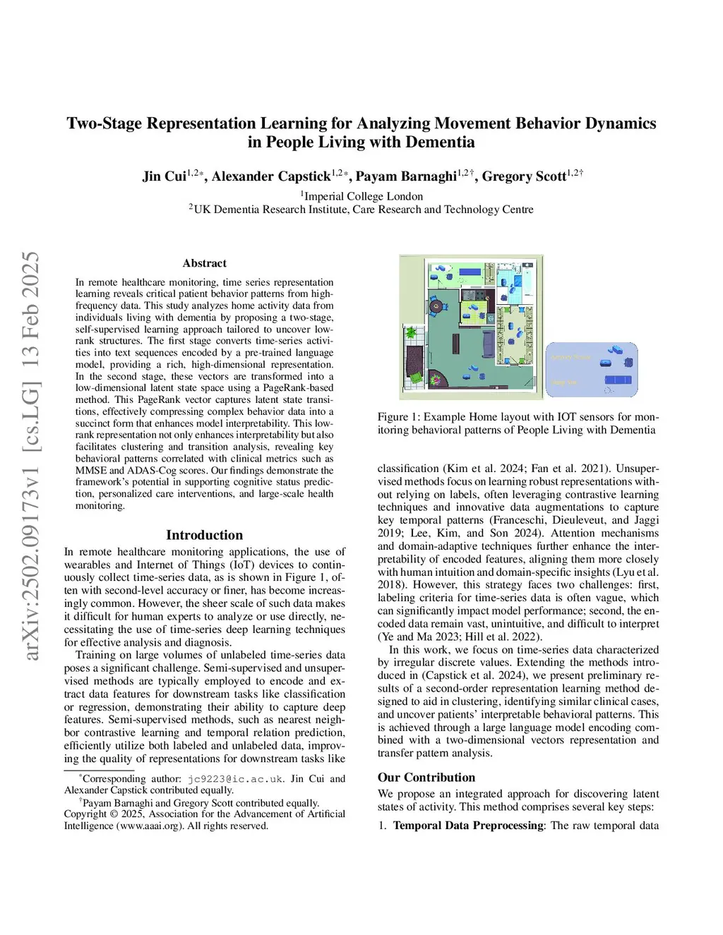 In remote healthcare monitoring, time series representation learning reveals critical patient behavior patterns from high-frequency data. This study analyzes home activity data from individuals living with dementia by proposing a two-stage, self-supervised learning approach tailored to uncover low-rank structures. The first stage converts time-series activities into text sequences encoded by a pre-trained language model, providing a rich, high-dimensional latent state space using a PageRank-based method. This PageRank vector captures latent state transitions, effectively compressing complex behaviour data into a succinct form that enhances interpretability. This low-rank representation not only enhances model interpretability but also facilitates clustering and transition analysis, revealing key behavioral patterns correlated with clinicalmetrics such as MMSE and ADAS-COG scores. Our findings demonstrate the framework's potential in supporting cognitive status prediction, personalized care interventions, and large-scale health monitoring.
