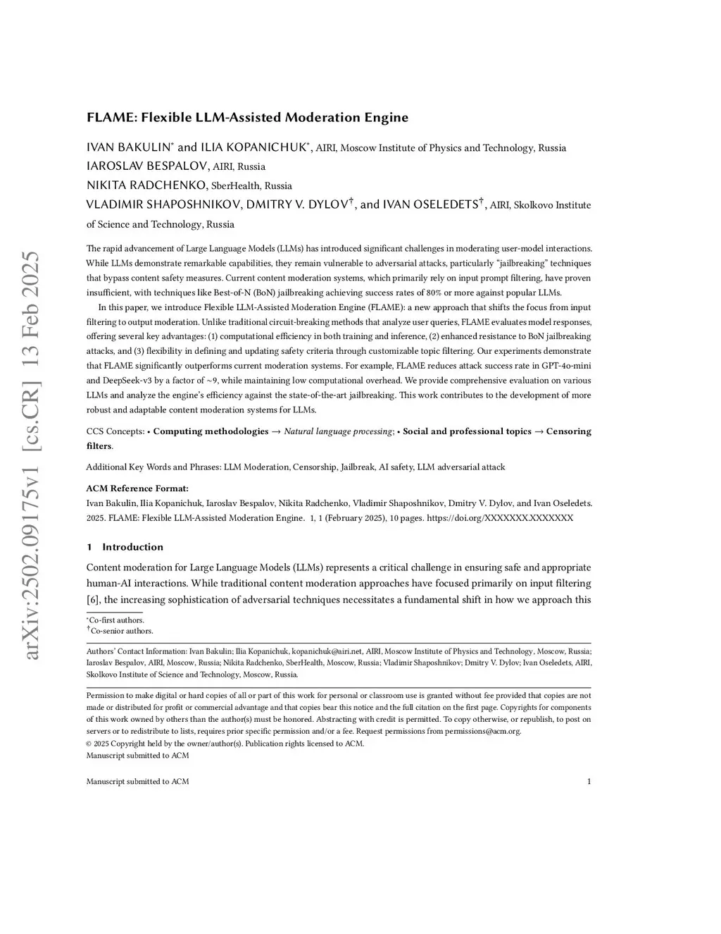 The rapid advancement of Large Language Models (LLMs) has introduced significant challenges in moderating user-model interactions. While LLMs demonstrate remarkable capabilities, they remain vulnerable to adversarial attacks, particularly ``jailbreaking'' techniques that bypass content safety measures. Current content moderation systems, which primarily rely on input prompt filtering, have proven insufficient, with techniques like Best-of-N (BoN) jailbreaking achieving success rates of 80% or more against popular LLMs. In this paper, we introduce Flexible LLM-Assisted Moderation Engine (FLAME): a new approach that shifts the focus from input filtering to output moderation. Unlike traditional circuit-breaking methods that analyze user queries, FLAME evaluates model responses, offering several key advantages: (1) computational efficiency in both training and inference, (2) enhanced resistance to BoN jailbreaking attacks, and (3) flexibility in defining and updating safety criteria through customizable topic filtering. Our experiments demonstrate that FLAME significantly outperforms current moderation systems. For example, FLAME reduces attack success rate in GPT-4o-mini and DeepSeek-v3 by a factor of ~9, while maintaining low computational overhead. We provide comprehensive evaluation on various LLMs and analyze the engine's efficiency against the state-of-the-art jailbreaking. This work contributes to the development of more robust and adaptable content moderation systems for LLMs.