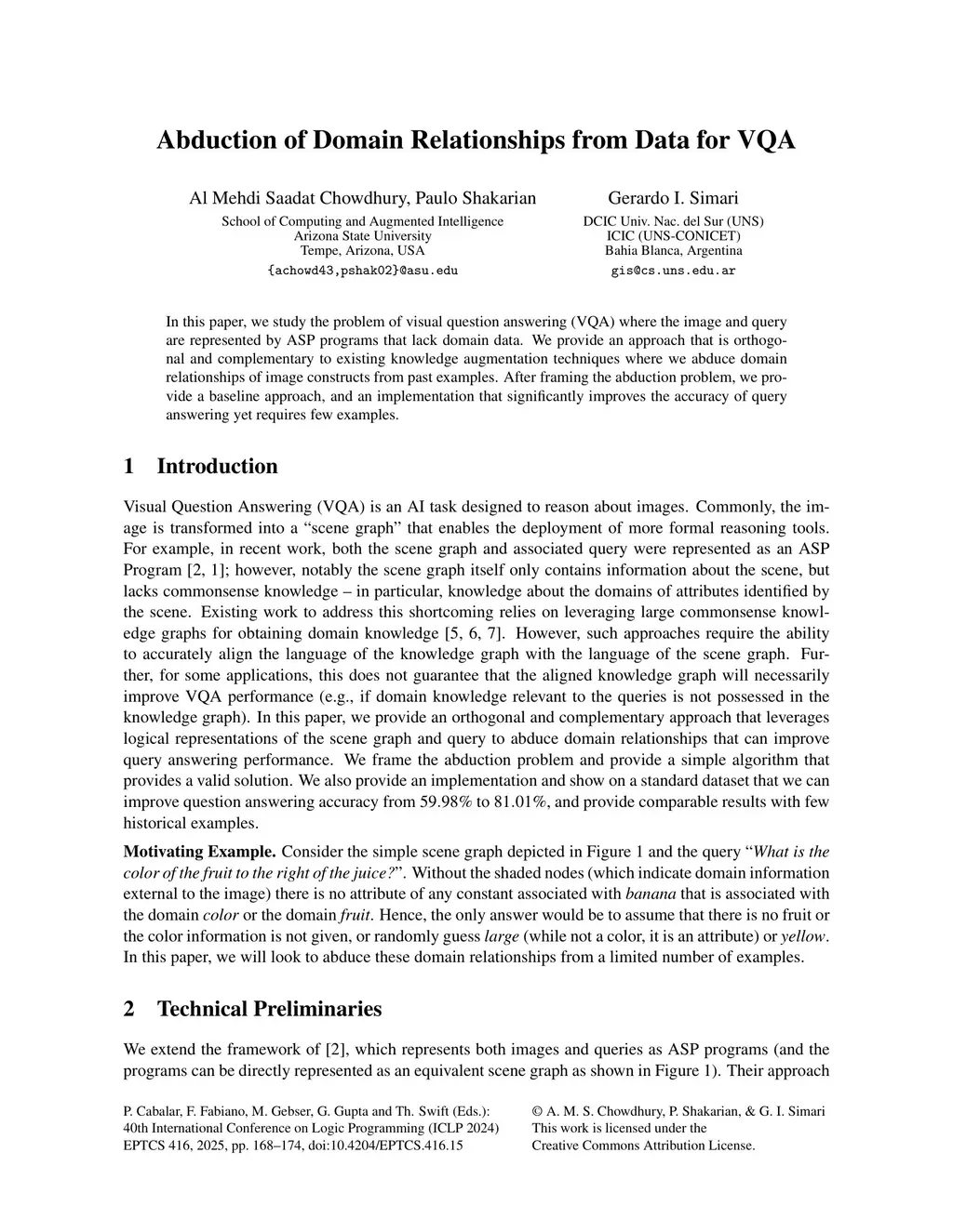 In this paper, we study the problem of visual question answering (VQA) where the image and query are represented by ASP programs that lack domain data. We provide an approach that is orthogonal and complementary to existing knowledge augmentation techniques where we abduce domain relationships of image constructs from past examples. After framing the abduction problem, we provide a baseline approach, and an implementation that significantly improves the accuracy of query answering yet requires few examples.