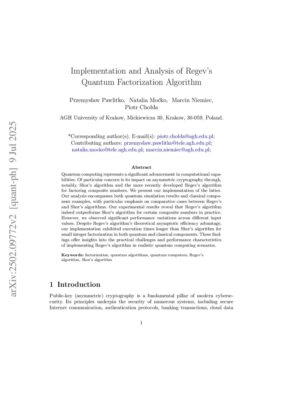 Quantum computing represents a significant advancement in computational capabilities. Of particular concern is its impact on asymmetric cryptography through, notably, Shor's algorithm and the more recently developed Regev's algorithm for factoring composite numbers. We present our implementation of the latter. Our analysis encompasses both quantum simulation results and classical component examples, with particular emphasis on comparative cases between Regev's and Shor's algorithms. Our experimental results reveal that Regev's algorithm indeed outperforms Shor's algorithm for certain composite numbers in practice. However, we observed significant performance variations across different input values. Despite Regev's algorithm's theoretical asymptotic efficiency advantage, our implementation exhibited execution times longer than Shor's algorithm for small integer factorization in both quantum and classical components. These findings offer insights into the practical challenges and performance characteristics of implementing Regev's algorithm in realistic quantum computing scenarios.