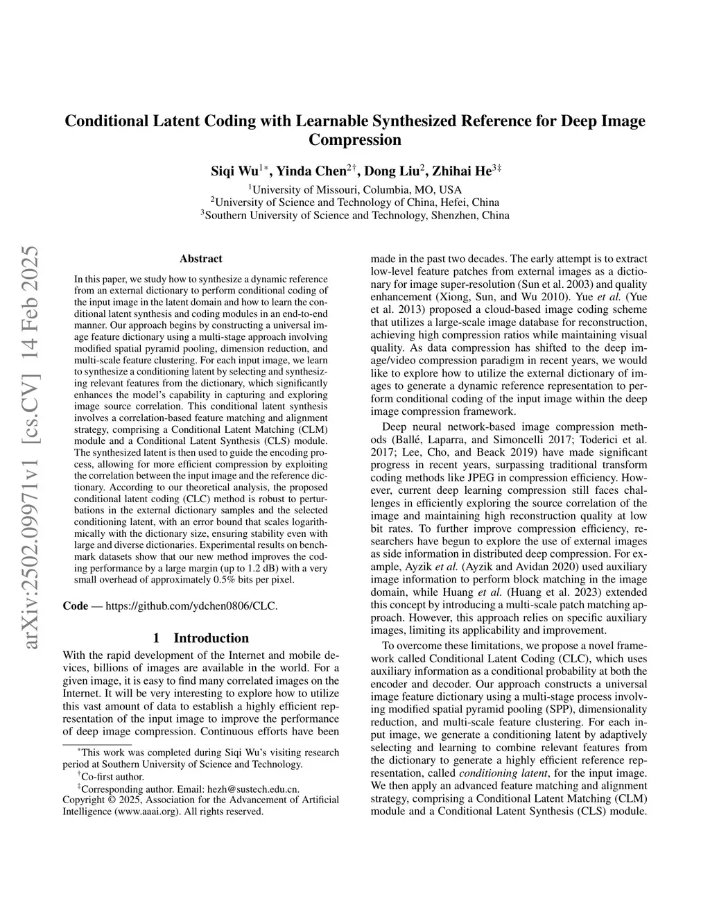 In this paper, we study how to synthesize a dynamic reference from an external dictionary to perform conditional coding of the input image in the latent domain and how to learn the conditional latent synthesis and coding modules in an end-to-end manner. Our approach begins by constructing a universal image feature dictionary using a multi-stage approach involving modified spatial pyramid pooling, dimension reduction, and multi-scale feature clustering. For each input image, we learn to synthesize a conditioning latent by selecting and synthesizing relevant features from the dictionary, which significantly enhances the model's capability in capturing and exploring image source correlation. This conditional latent synthesis involves a correlation-based feature matching and alignment strategy, comprising a Conditional Latent Matching (CLM) module and a Conditional Latent Synthesis (CLS) module. The synthesized latent is then used to guide the encoding process, allowing for more efficient compression by exploiting the correlation between the input image and the reference dictionary. According to our theoretical analysis, the proposed conditional latent coding (CLC) method is robust to perturbations in the external dictionary samples and the selected conditioning latent, with an error bound that scales logarithmically with the dictionary size, ensuring stability even with large and diverse dictionaries. Experimental results on benchmark datasets show that our new method improves the coding performance by a large margin (up to 1.2 dB) with a very small overhead of approximately 0.5\% bits per pixel. Our code is publicly available atthis https URL.