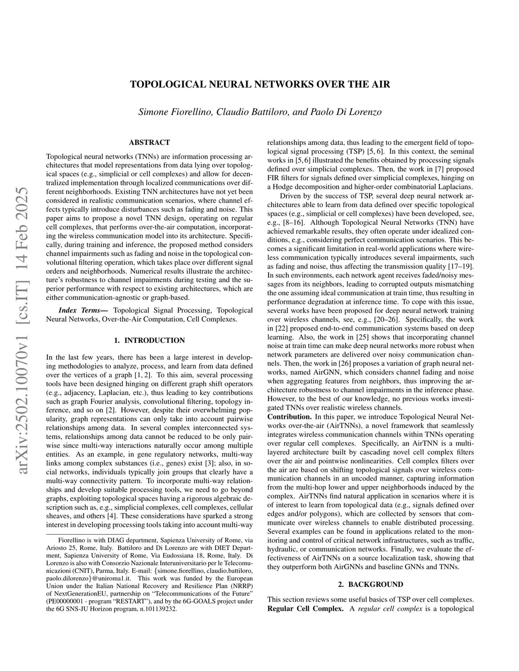 Topological neural networks (TNNs) are information processing architectures that model representations from data lying over topological spaces (e.g., simplicial or cell complexes) and allow for decentralized implementation through localized communications over different neighborhoods. Existing TNN architectures have not yet been considered in realistic communication scenarios, where channel effects typically introduce disturbances such as fading and noise. This paper aims to propose a novel TNN design, operating on regular cell complexes, that performs over-the-air computation, incorporating the wireless communication model into its architecture. Specifically, during training and inference, the proposed method considers channel impairments such as fading and noise in the topological convolutional filtering operation, which takes place over different signal orders and neighborhoods. Numerical results illustrate the architecture's robustness to channel impairments during testing and the superior performance with respect to existing architectures, which are either communication-agnostic or graph-based.
