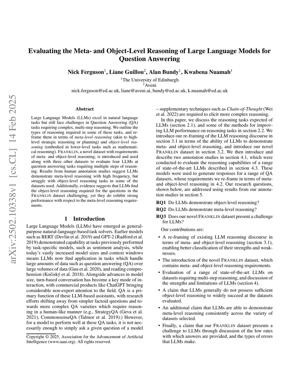 Large Language Models (LLMs) excel in natural language tasks but still face challenges in Question Answering (QA) tasks requiring complex, multi-step reasoning. We outline the types of reasoning required in some of these tasks, and reframe them in terms of meta-level reasoning (akin to high-level strategic reasoning or planning) and object-level reasoning (embodied in lower-level tasks such as mathematical reasoning). Franklin, a novel dataset with requirements of meta- and object-level reasoning, is introduced and used along with three other datasets to evaluate four LLMs at question answering tasks requiring multiple steps of reasoning. Results from human annotation studies suggest LLMs demonstrate meta-level reasoning with high frequency, but struggle with object-level reasoning tasks in some of the datasets used. Additionally, evidence suggests that LLMs find the object-level reasoning required for the questions in the Franklin dataset challenging, yet they do exhibit strong performance with respect to the meta-level reasoning requirements.