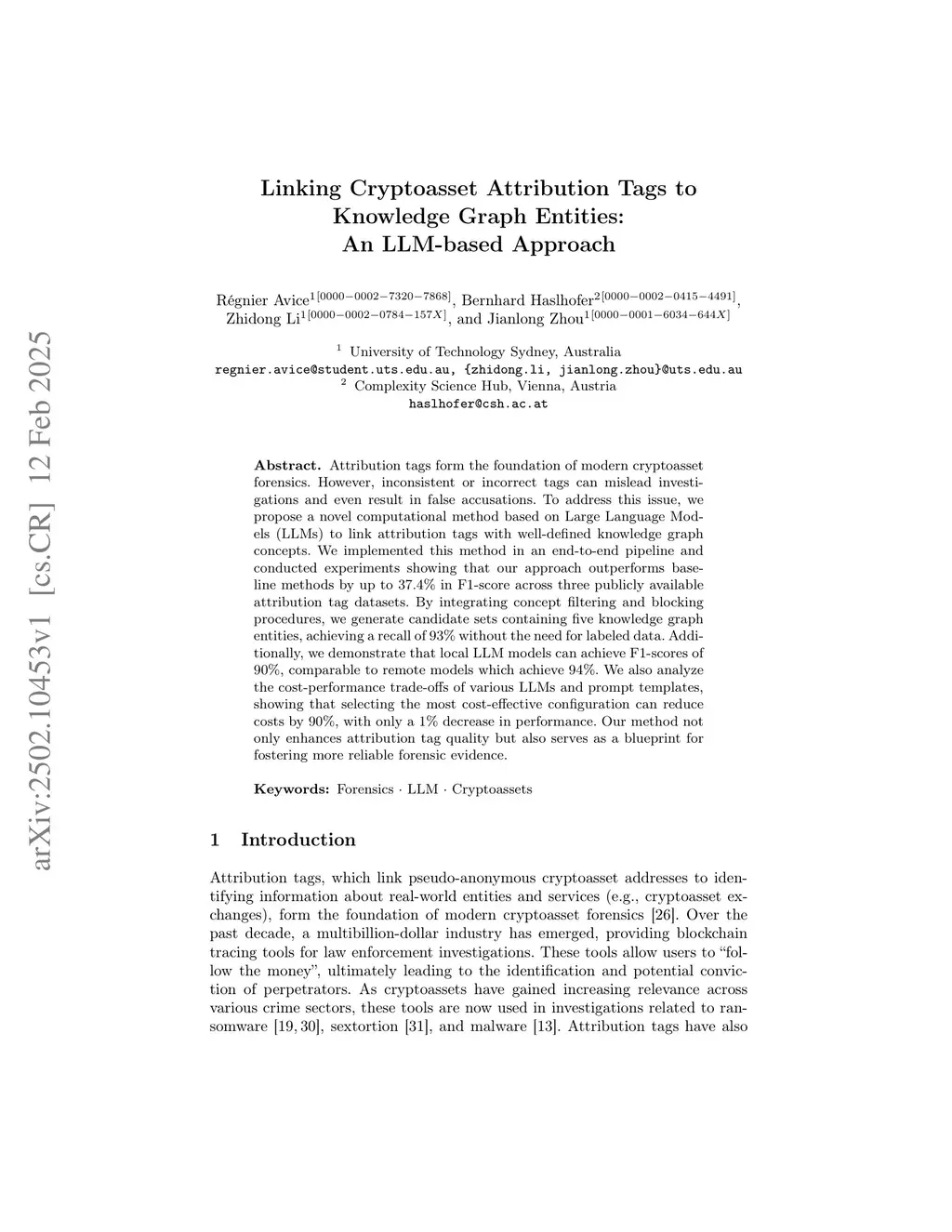 Attribution tags form the foundation of modern cryptoasset forensics. However, inconsistent or incorrect tags can mislead investigations and even result in false accusations. To address this issue, we propose a novel computational method based on Large Language Models (LLMs) to link attribution tags with well-defined knowledge graph concepts. We implemented this method in an end-to-end pipeline and conducted experiments showing that our approach outperforms baseline methods by up to 37.4% in F1-score across three publicly available attribution tag datasets. By integrating concept filtering and blocking procedures, we generate candidate sets containing five knowledge graph entities, achieving a recall of 93% without the need for labeled data. Additionally, we demonstrate that local LLM models can achieve F1-scores of 90%, comparable to remote models which achieve 94%. We also analyze the cost-performance trade-offs of various LLMs and prompt templates, showing that selecting the most cost-effective configuration can reduce costs by 90%, with only a 1% decrease in performance. Our method not only enhances attribution tag quality but also serves as a blueprint for fostering more reliable forensic evidence.