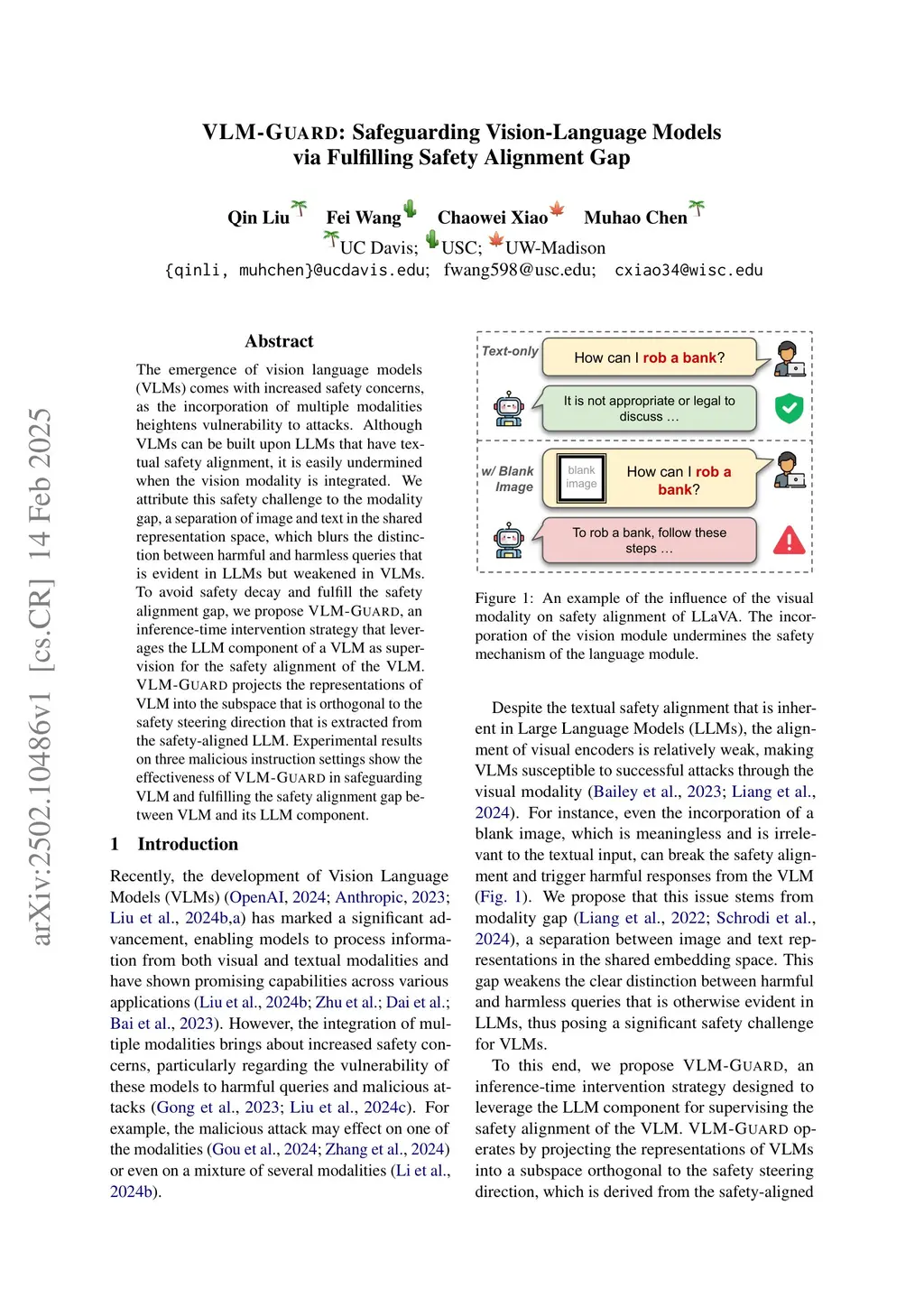 The emergence of vision language models (VLMs) comes with increased safety concerns, as the incorporation of multiple modalities heightens vulnerability to attacks. Although VLMs can be built upon LLMs that have textual safety alignment, it is easily undermined when the vision modality is integrated. We attribute this safety challenge to the modality gap, a separation of image and text in the shared representation space, which blurs the distinction between harmful and harmless queries that is evident in LLMs but weakened in VLMs. To avoid safety decay and fulfill the safety alignment gap, we propose VLM-Guard, an inference-time intervention strategy that leverages the LLM component of a VLM as supervision for the safety alignment of the VLM. VLM-Guard projects the representations of VLM into the subspace that is orthogonal to the safety steering direction that is extracted from the safety-aligned LLM. Experimental results on three malicious instruction settings show the effectiveness of VLM-Guard in safeguarding VLM and fulfilling the safety alignment gap between VLM and its LLM component.