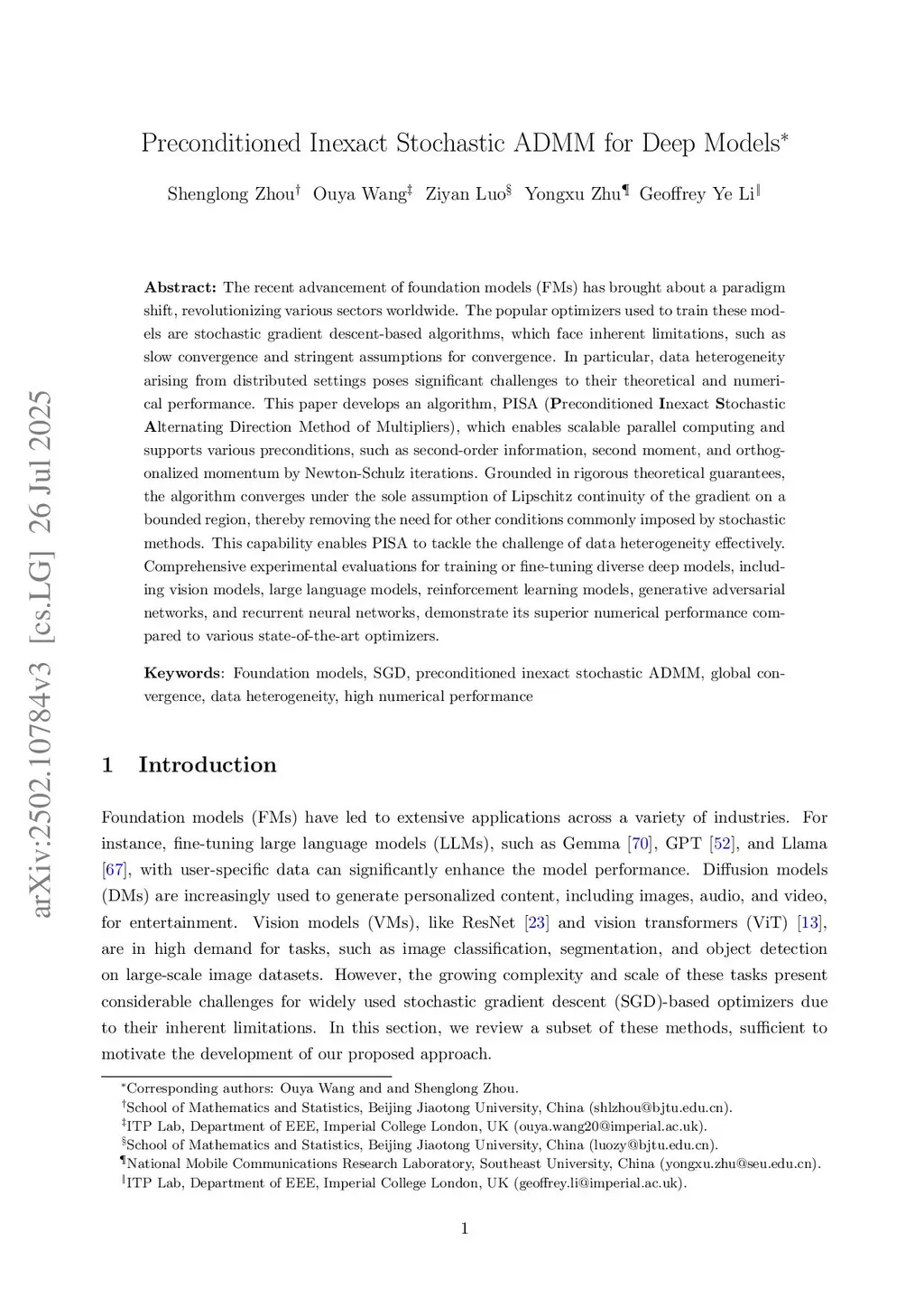 The recent advancement of foundation models (FMs) has brought about a paradigm shift, revolutionizing various sectors worldwide. The popular optimizers used to train these models are stochastic gradient descent-based algorithms, which face inherent limitations, such as slow convergence and stringent assumptions for convergence. In particular, data heterogeneity arising from distributed settings poses significant challenges to their theoretical and numerical performance. This paper develops an algorithm, PISA (Preconditioned Inexact Stochastic Alternating Direction Method of Multipliers). Grounded in rigorous theoretical guarantees, the algorithm converges under the sole assumption of Lipschitz continuity of the gradient on a bounded region, thereby removing the need for other conditions commonly imposed by stochastic methods. This capability enables the proposed algorithm to tackle the challenge of data heterogeneity effectively. Moreover, the algorithmic architecture enables scalable parallel computing and supports various preconditions, such as second-order information, second moment, and orthogonalized momentum by Newton-Schulz iterations. Incorporating the latter two preconditions in PISA yields two computationally efficient variants: SISA and NSISA. Comprehensive experimental evaluations for training or fine-tuning diverse deep models, including vision models, large language models, reinforcement learning models, generative adversarial networks, and recurrent neural networks, demonstrate superior numerical performance of SISA and NSISA compared to various state-of-the-art optimizers.