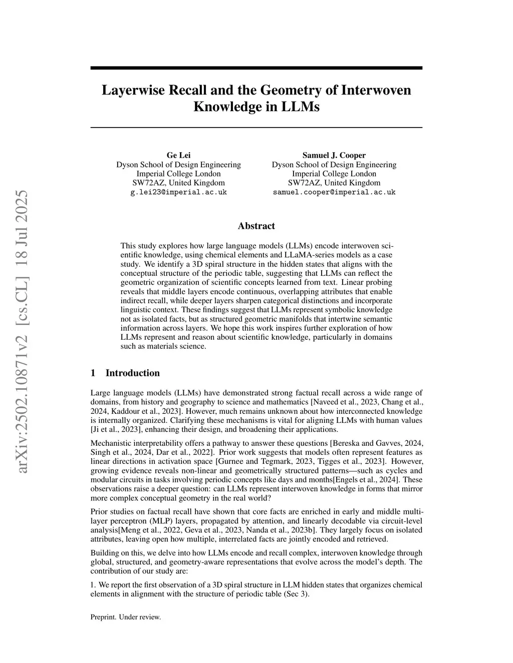 This study explores how large language models (LLMs) encode interwoven scientific knowledge, using chemical elements and LLaMA-series models as a case study. We identify a 3D spiral structure in the hidden states that aligns with the conceptual structure of the periodic table, suggesting that LLMs can reflect the geometric organization of scientific concepts learned from text. Linear probing reveals that middle layers encode continuous, overlapping attributes that enable indirect recall, while deeper layers sharpen categorical distinctions and incorporate linguistic context. These findings suggest that LLMs represent symbolic knowledge not as isolated facts, but as structured geometric manifolds that intertwine semantic information across layers. We hope this work inspires further exploration of how LLMs represent and reason about scientific knowledge, particularly in domains such as materials science.