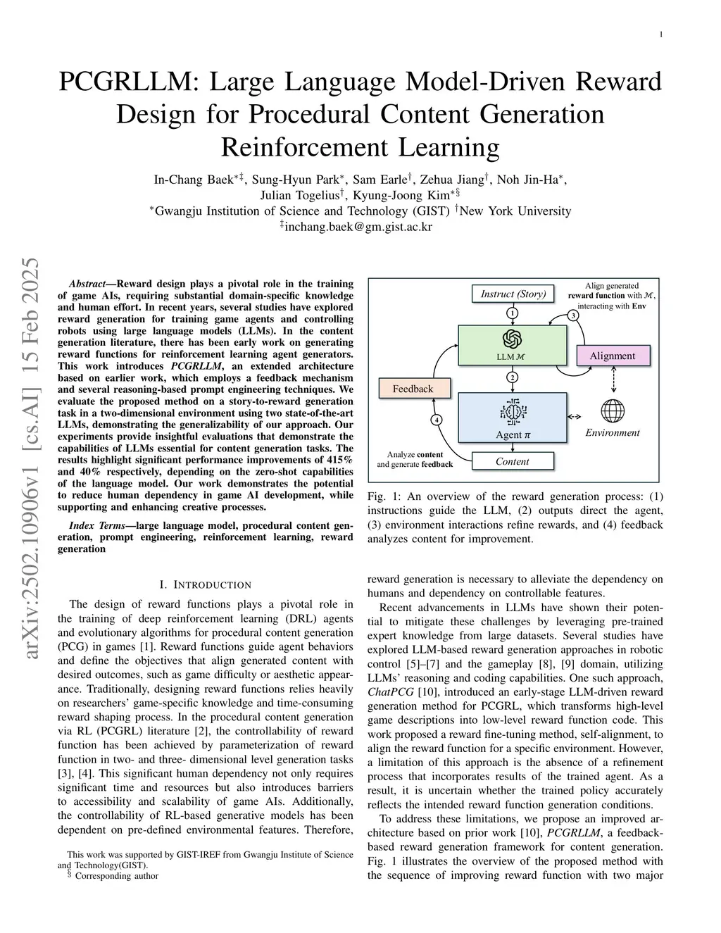 Reward design plays a pivotal role in the training of game AIs, requiring substantial domain-specific knowledge and human effort. In recent years, several studies have explored reward generation for training game agents and controlling robots using large language models (LLMs). In the content generation literature, there has been early work on generating reward functions for reinforcement learning agent generators. This work introduces PCGRLLM, an extended architecture based on earlier work, which employs a feedback mechanism and several reasoning-based prompt engineering techniques. We evaluate the proposed method on a story-to-reward generation task in a two-dimensional environment using two state-of-the-art LLMs, demonstrating the generalizability of our approach. Our experiments provide insightful evaluations that demonstrate the capabilities of LLMs essential for content generation tasks. The results highlight significant performance improvements of 415% and 40% respectively, depending on the zero-shot capabilities of the language model. Our work demonstrates the potential to reduce human dependency in game AI development, while supporting and enhancing creative processes.