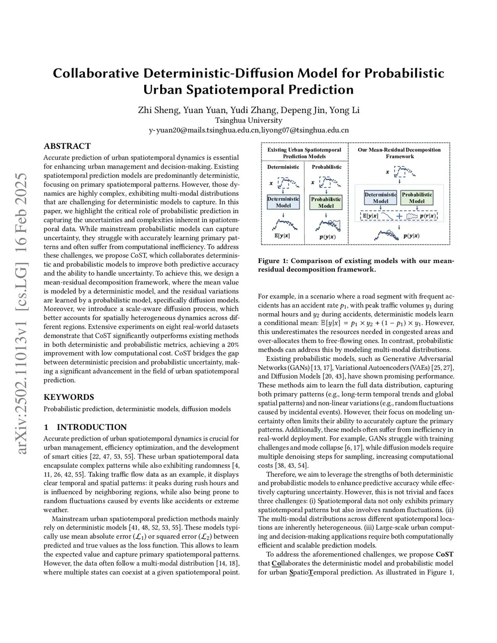 Probabilistic forecasting is crucial for real-world spatiotemporal systems, such as climate, energy, and urban environments, where quantifying uncertainty is essential for informed, risk-aware decision-making. While diffusion models have shown promise in capturing complex data distributions, their application to spatiotemporal forecasting remains limited due to complex spatiotemporal dynamics and high computational demands. we propose CoST, a general forecasting framework that collaborates deterministic and diffusion models for diverse spatiotemporal systems. CoST formulates a mean-residual decomposition strategy: it leverages a powerful deterministic model to capture the conditional mean and a lightweight diffusion model to learn residual uncertainties. This collaborative formulation simplifies learning objectives, improves accuracy and efficiency, and generalizes across diverse spatiotemporal systems. To address spatial heterogeneity, we further design a scale-aware diffusion mechanism to guide the diffusion process. Extensive experiments across ten real-world datasets from climate, energy, communication, and urban systems show that CoST achieves 25\% performance gains over state-of-the-art baselines, while significantly reducing computational cost.
