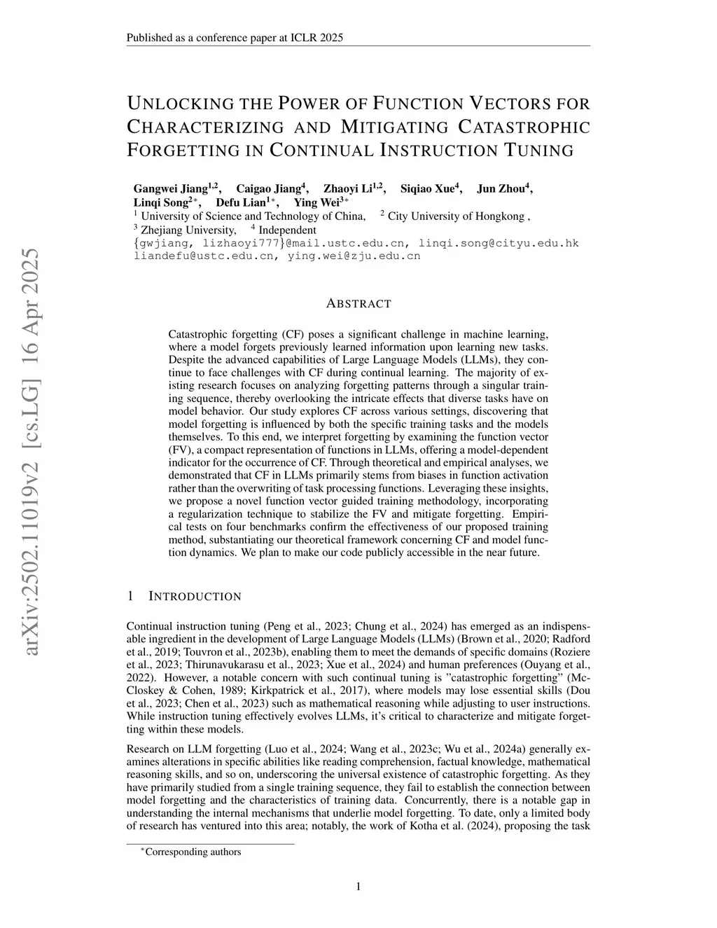 Catastrophic forgetting (CF) poses a significant challenge in machine learning, where a model forgets previously learned information upon learning new tasks. Despite the advanced capabilities of Large Language Models (LLMs), they continue to face challenges with CF during continual learning. The majority of existing research focuses on analyzing forgetting patterns through a singular training sequence, thereby overlooking the intricate effects that diverse tasks have on model behavior. Our study explores CF across various settings, discovering that model forgetting is influenced by both the specific training tasks and the models themselves. To this end, we interpret forgetting by examining the function vector (FV), a compact representation of functions in LLMs, offering a model-dependent indicator for the occurrence of CF. Through theoretical and empirical analyses, we demonstrated that CF in LLMs primarily stems from biases in function activation rather than the overwriting of task processing functions. Leveraging these insights, we propose a novel function vector guided training methodology, incorporating a regularization technique to stabilize the FV and mitigate forgetting. Empirical tests on four benchmarks confirm the effectiveness of our proposed training method, substantiating our theoretical framework concerning CF and model function dynamics. We plan to make our code publicly accessible in the near future.