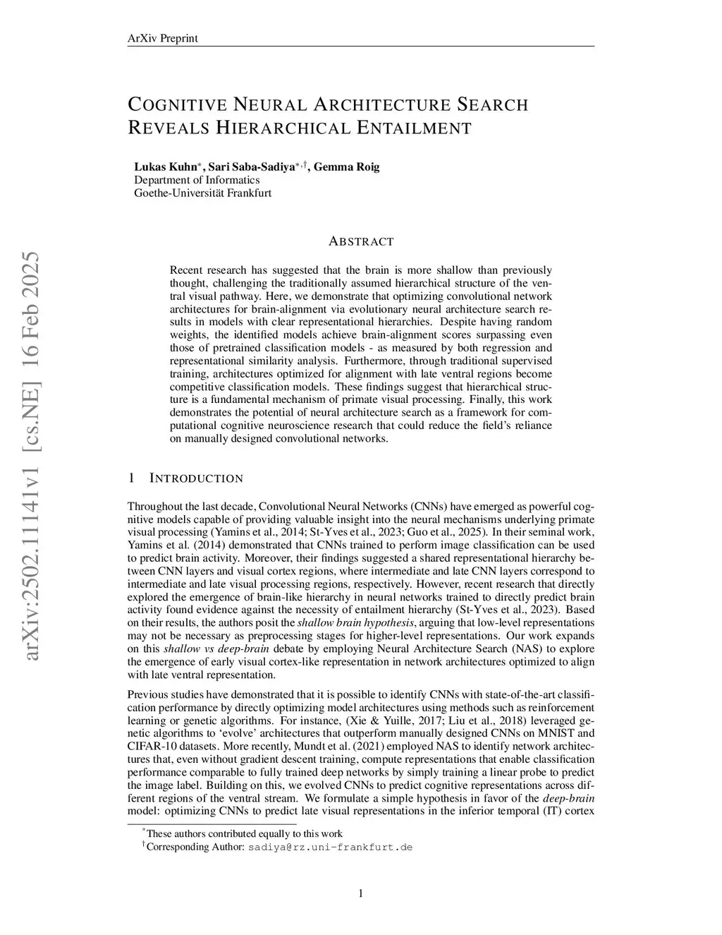 Recent research has suggested that the brain is more shallow than previously thought, challenging the traditionally assumed hierarchical structure of the ventral visual pathway. Here, we demonstrate that optimizing convolutional network architectures for brain-alignment via evolutionary neural architecture search results in models with clear representational hierarchies. Despite having random weights, the identified models achieve brain-alignment scores surpassing even those of pretrained classification models - as measured by both regression and representational similarity analysis. Furthermore, through traditional supervised training, architectures optimized for alignment with late ventral regions become competitive classification models. These findings suggest that hierarchical structure is a fundamental mechanism of primate visual processing. Finally, this work demonstrates the potential of neural architecture search as a framework for computational cognitive neuroscience research that could reduce the field's reliance on manually designed convolutional networks.