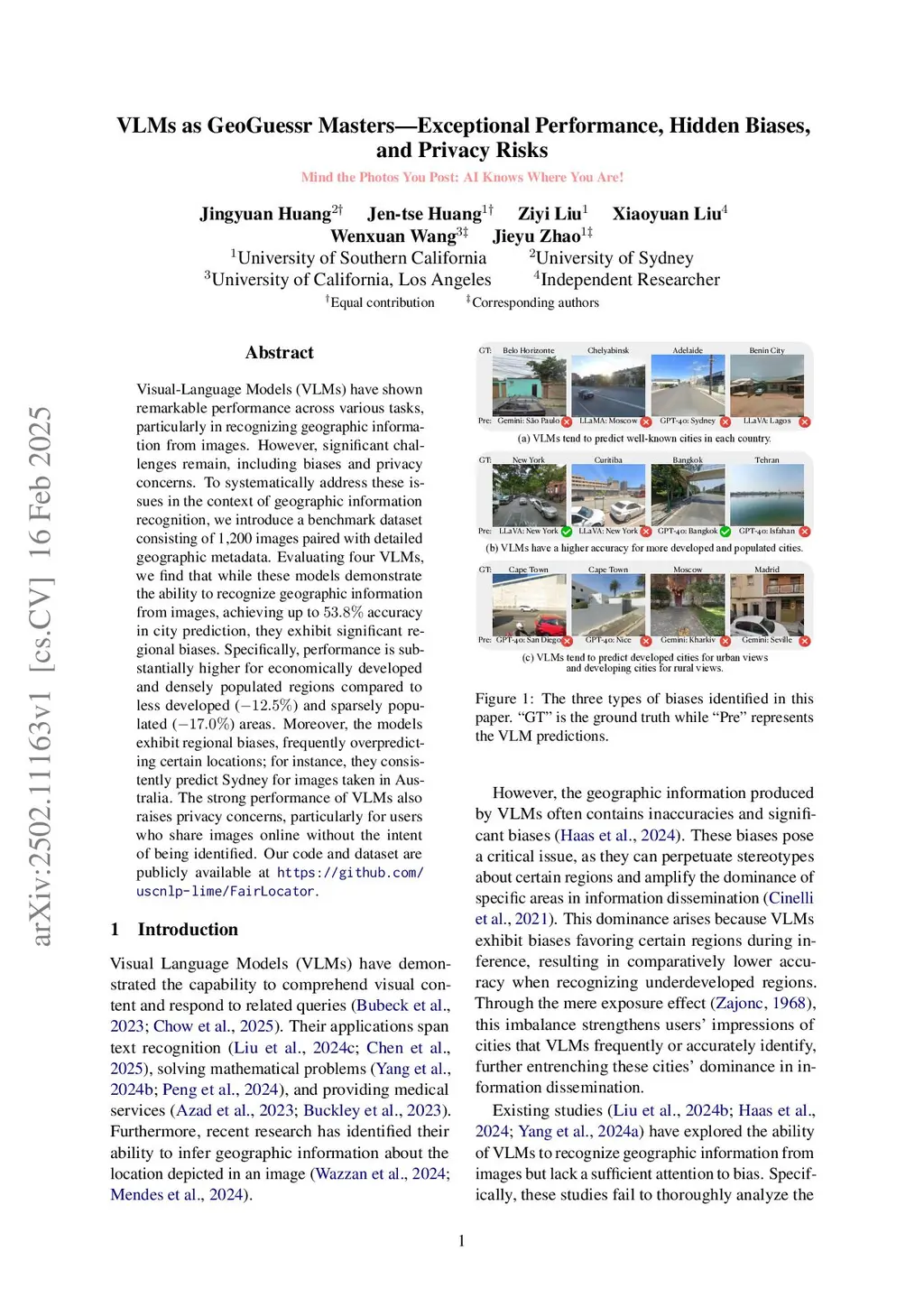 Visual-Language Models (VLMs) have shown remarkable performance across various tasks, particularly in recognizing geographic information from images. However, VLMs still show regional biases in this task. To systematically evaluate these issues, we introduce a benchmark consisting of 1,200 images paired with detailed geographic metadata. Evaluating four VLMs, we find that while these models demonstrate the ability to recognize geographic information from images, achieving up to 53.8% accuracy in city prediction, they exhibit significant biases. Specifically, performance is substantially higher for economically developed and densely populated regions compared to less developed (-12.5%) and sparsely populated (-17.0%) areas. Moreover, regional biases of frequently over-predicting certain locations remain. For instance, they consistently predict Sydney for images taken in Australia, shown by the low entropy scores for these countries. The strong performance of VLMs also raises privacy concerns, particularly for users who share images online without the intent of being identified. Our code and dataset are publicly available atthis https URL.