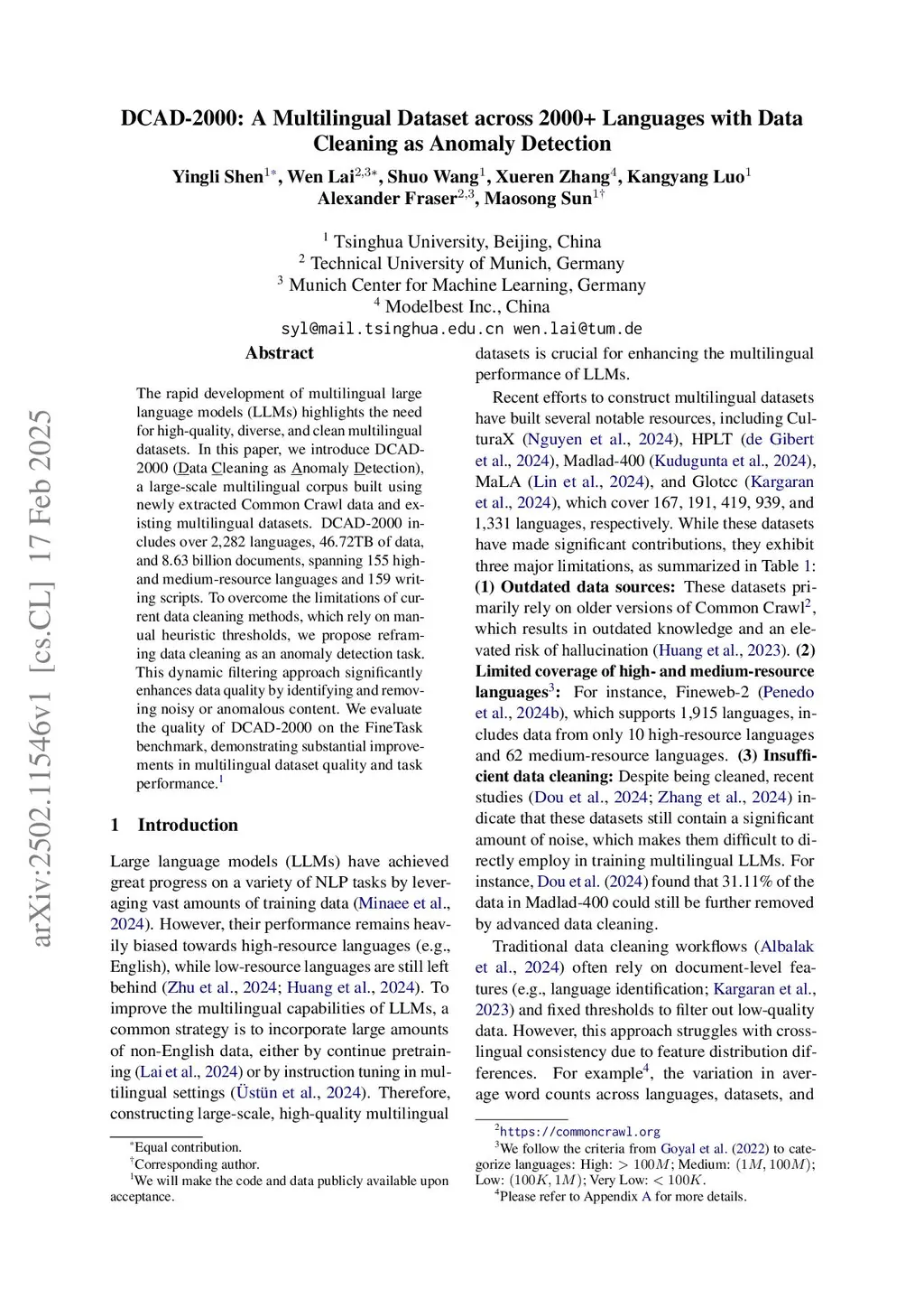 The rapid development of multilingual large language models (LLMs) highlights the need for high-quality, diverse, and well-curated multilingual datasets. In this paper, we introduce DCAD-2000 (Data Cleaning as Anomaly Detection), a large-scale multilingual corpus constructed from newly extracted Common Crawl data and existing multilingual sources. DCAD-2000 covers 2,282 languages, 46.72TB of text, and 8.63 billion documents, spanning 155 high- and medium-resource languages and 159 writing scripts. To overcome the limitations of existing data cleaning approaches, which rely on manually designed heuristic thresholds, we reframe data cleaning as an anomaly detection problem. This dynamic filtering paradigm substantially improves data quality by automatically identifying and removing noisy or anomalous content. By fine-tuning LLMs on DCAD-2000, we demonstrate notable improvements in data quality, robustness of the cleaning pipeline, and downstream performance, particularly for low-resource languages across multiple multilingual benchmarks.