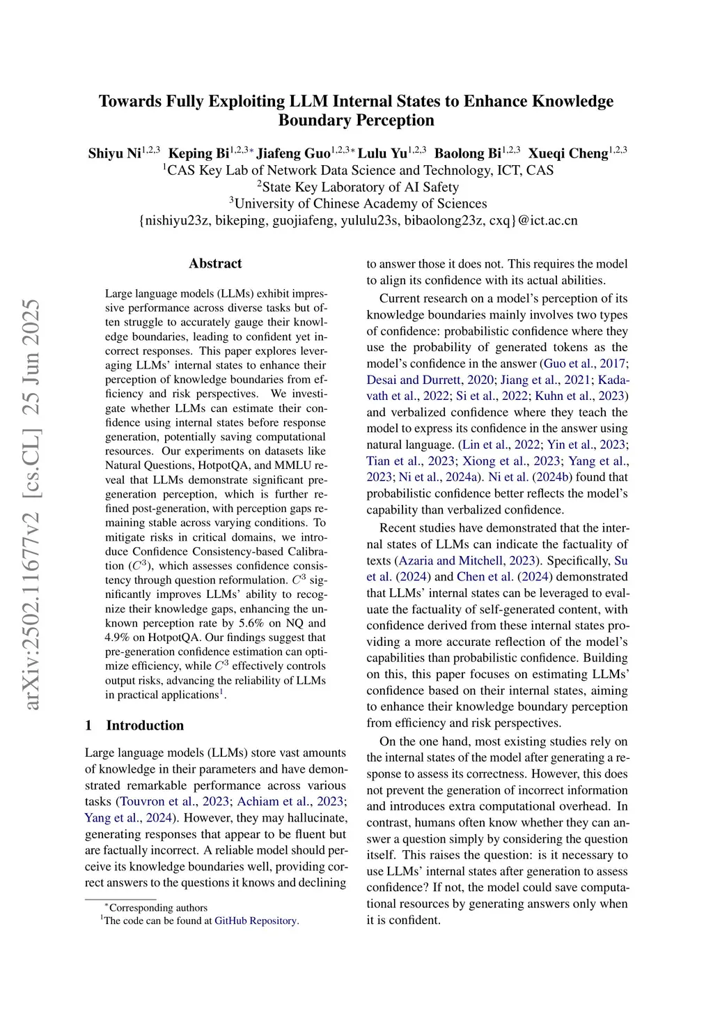 Large language models (LLMs) exhibit impressive performance across diverse tasks but often struggle to accurately gauge their knowledge boundaries, leading to confident yet incorrect responses. This paper explores leveraging LLMs' internal states to enhance their perception of knowledge boundaries from efficiency and risk perspectives. We investigate whether LLMs can estimate their confidence using internal states before response generation, potentially saving computational resources. Our experiments on datasets like Natural Questions, HotpotQA, and MMLU reveal that LLMs demonstrate significant pre-generation perception, which is further refined post-generation, with perception gaps remaining stable across varying conditions. To mitigate risks in critical domains, we introduce Confidence Consistency-based Calibration (), which assesses confidence consistency through question reformulation. significantly improves LLMs' ability to recognize their knowledge gaps, enhancing the unknown perception rate by 5.6% on NQ and 4.9% on HotpotQA. Our findings suggest that pre-generation confidence estimation can optimize efficiency, while effectively controls output risks, advancing the reliability of LLMs in practical applications.