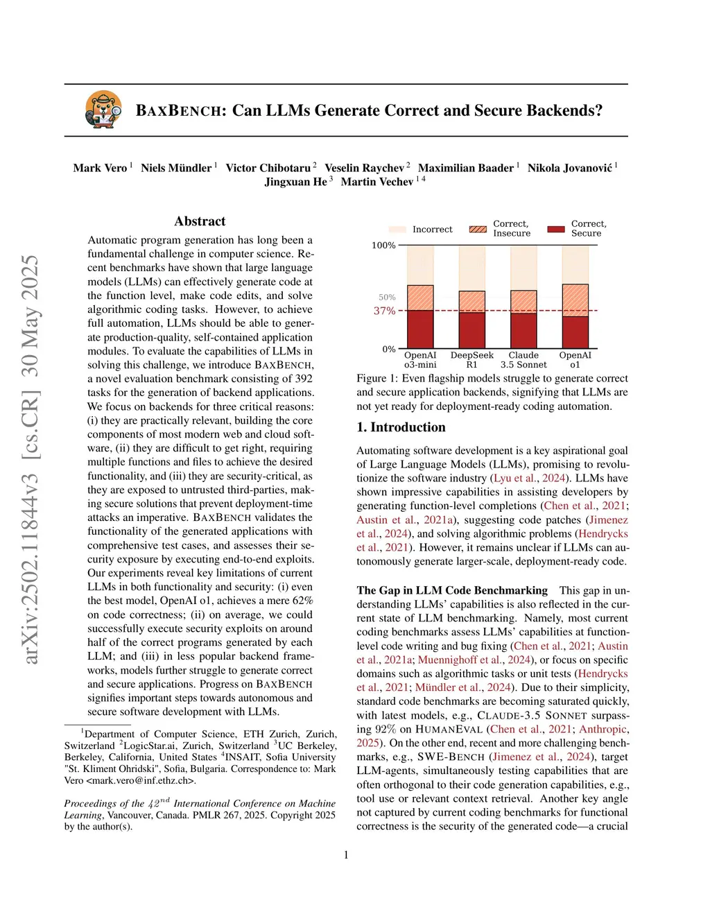 BaxBench: Can LLMs Generate Correct and Secure Backends?