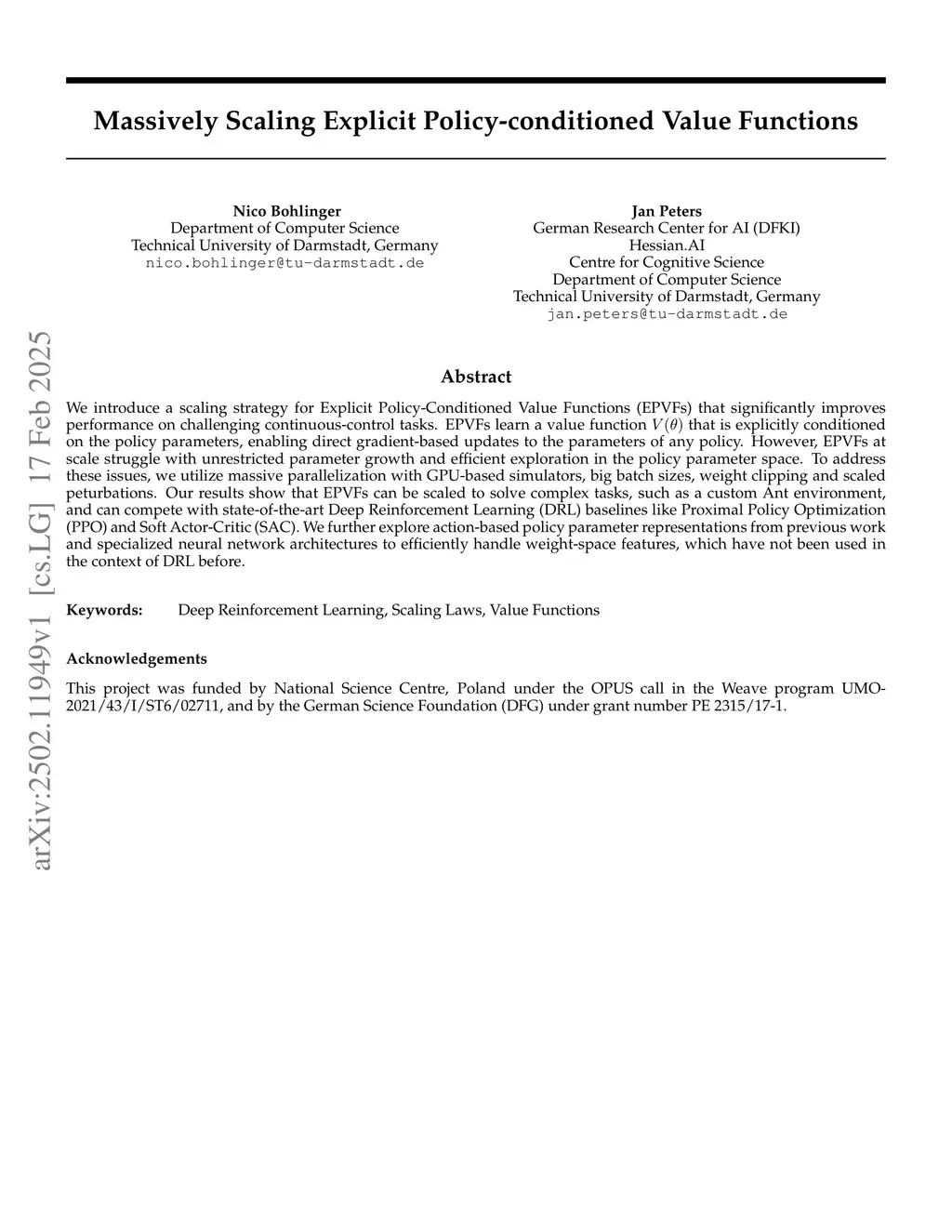 We introduce a scaling strategy for Explicit Policy-Conditioned Value Functions (EPVFs) that significantly improves performance on challenging continuous-control tasks. EPVFs learn a value function V({\theta}) that is explicitly conditioned on the policy parameters, enabling direct gradient-based updates to the parameters of any policy. However, EPVFs at scale struggle with unrestricted parameter growth and efficient exploration in the policy parameter space. To address these issues, we utilize massive parallelization with GPU-based simulators, big batch sizes, weight clipping and scaled peturbations. Our results show that EPVFs can be scaled to solve complex tasks, such as a custom Ant environment, and can compete with state-of-the-art Deep Reinforcement Learning (DRL) baselines like Proximal Policy Optimization (PPO) and Soft Actor-Critic (SAC). We further explore action-based policy parameter representations from previous work and specialized neural network architectures to efficiently handle weight-space features, which have not been used in the context of DRL before.