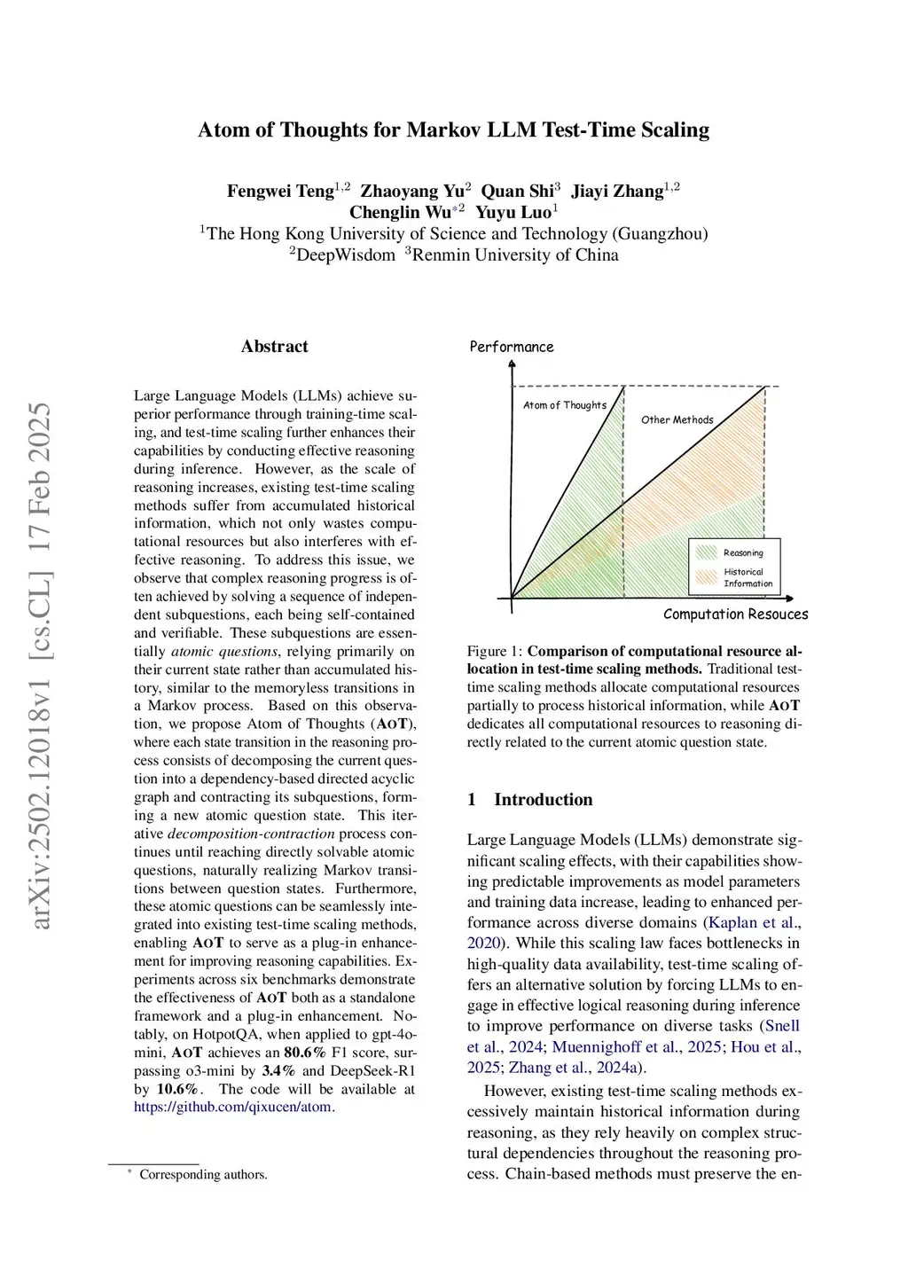 Large Language Models (LLMs) have achieved significant performance gains through test-time scaling methods. However, existing approaches often incur redundant computations due to the accumulation of historical dependency information during inference. To address this challenge, we leverage the memoryless property of Markov processes to minimize reliance on historical context and propose a Markovian reasoning process. This foundational Markov chain structure enables seamless integration with various test-time scaling methods, thereby improving their scaling efficiency. By further scaling up the Markovian reasoning chain through integration with techniques such as tree search and reflective refinement, we uncover an emergent atomic reasoning structure, where reasoning trajectories are decomposed into a series of self-contained, low-complexity atomic units. We name this design Atom of Thoughts (\our). Extensive experiments demonstrate that \our consistently outperforms existing baselines as computational budgets increase. Importantly, \our integrates seamlessly with existing reasoning frameworks and different LLMs (both reasoning and non-reasoning), facilitating scalable, high-performancethis http URLsubmit our code alongside this paper and will make it publicly available to facilitate reproducibility and future research.