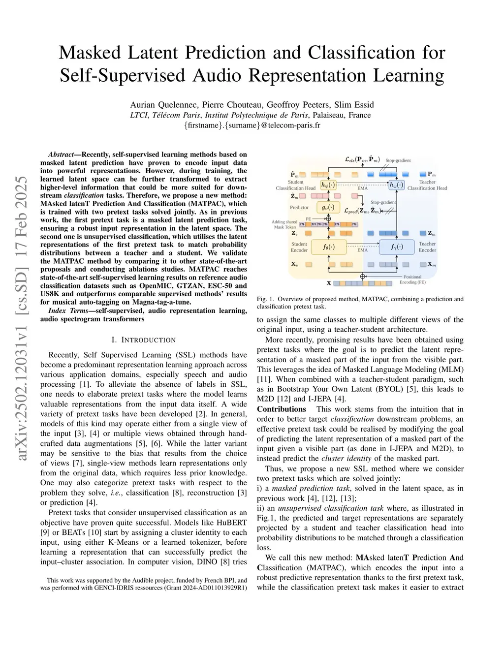Recently, self-supervised learning methods based on masked latent prediction have proven to encode input data into powerful representations. However, during training, the learned latent space can be further transformed to extract higher-level information that could be more suited for downstream classification tasks. Therefore, we propose a new method: MAsked latenT Prediction And Classification (MATPAC), which is trained with two pretext tasks solved jointly. As in previous work, the first pretext task is a masked latent prediction task, ensuring a robust input representation in the latent space. The second one is unsupervised classification, which utilises the latent representations of the first pretext task to match probability distributions between a teacher and a student. We validate the MATPAC method by comparing it to other state-of-the-art proposals and conducting ablations studies. MATPAC reaches state-of-the-art self-supervised learning results on reference audio classification datasets such as OpenMIC, GTZAN, ESC-50 and US8K and outperforms comparable supervised methods results for musical auto-tagging on Magna-tag-a-tune.