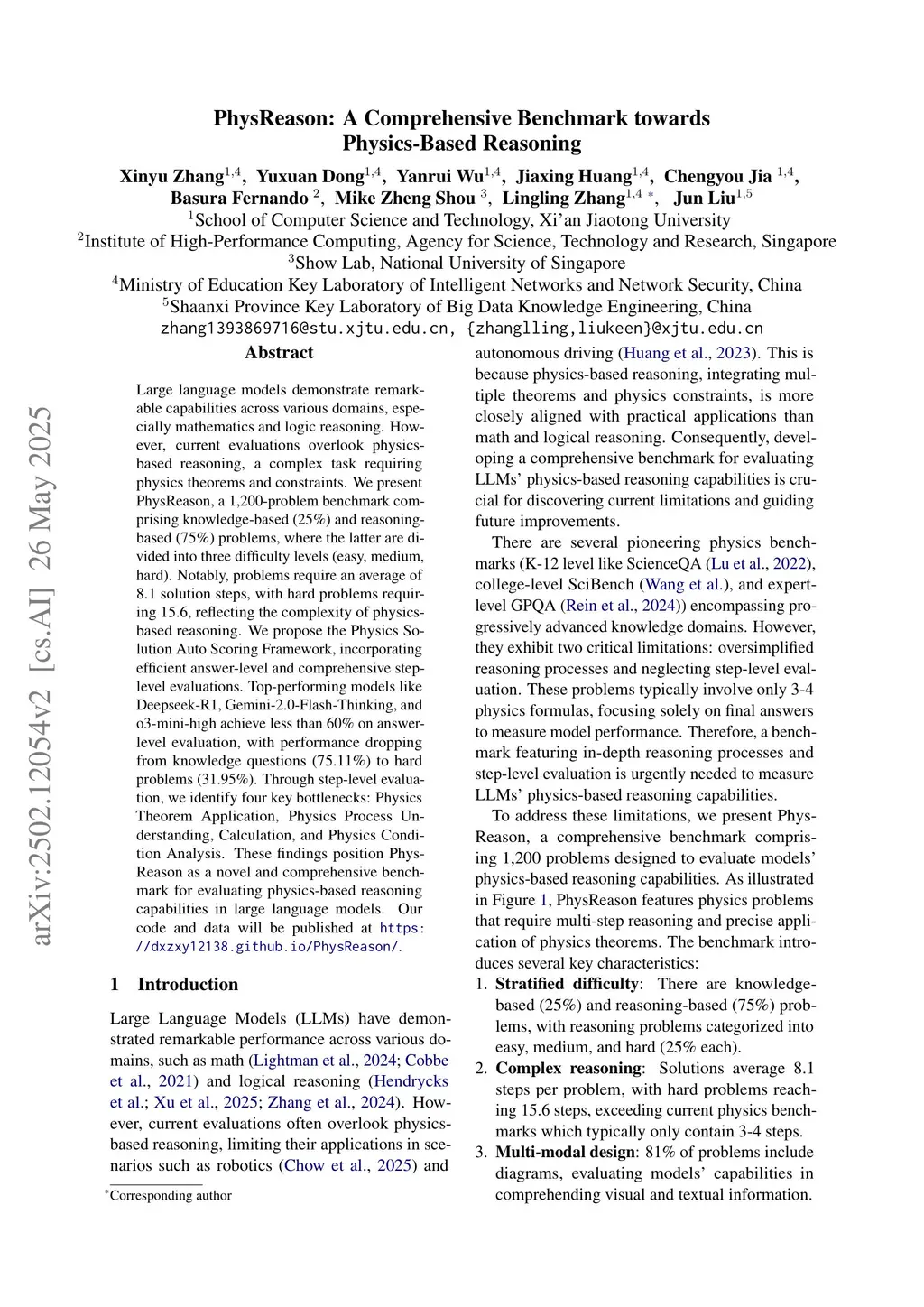 Large language models demonstrate remarkable capabilities across various domains, especially mathematics and logic reasoning. However, current evaluations overlook physics-based reasoning - a complex task requiring physics theorems and constraints. We present PhysReason, a 1,200-problem benchmark comprising knowledge-based (25%) and reasoning-based (75%) problems, where the latter are divided into three difficulty levels (easy, medium, hard). Notably, problems require an average of 8.1 solution steps, with hard requiring 15.6, reflecting the complexity of physics-based reasoning. We propose the Physics Solution Auto Scoring Framework, incorporating efficient answer-level and comprehensive step-level evaluations. Top-performing models like Deepseek-R1, Gemini-2.0-Flash-Thinking, and o3-mini-high achieve less than 60% on answer-level evaluation, with performance dropping from knowledge questions (75.11%) to hard problems (31.95%). Through step-level evaluation, we identified four key bottlenecks: Physics Theorem Application, Physics Process Understanding, Calculation, and Physics Condition Analysis. These findings position PhysReason as a novel and comprehensive benchmark for evaluating physics-based reasoning capabilities in large language models. Our code and data will be published athttps:/dxzxy12138.github.io/PhysReason.