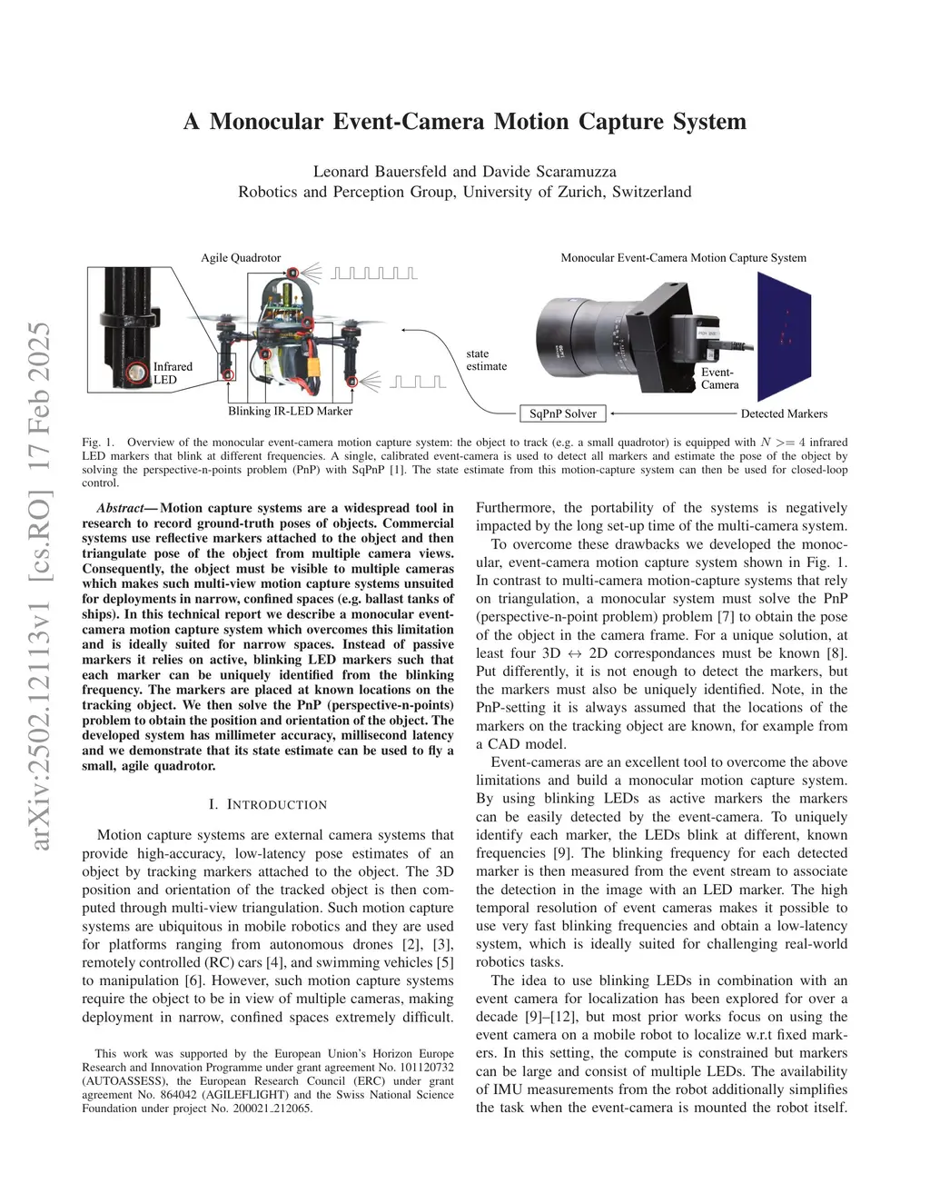 Motion capture systems are a widespread tool in research to record ground-truth poses of objects. Commercial systems use reflective markers attached to the object and then triangulate pose of the object from multiple camera views. Consequently, the object must be visible to multiple cameras which makes such multi-view motion capture systems unsuited for deployments in narrow, confined spaces (e.g. ballast tanks of ships). In this technical report we describe a monocular event-camera motion capture system which overcomes this limitation and is ideally suited for narrow spaces. Instead of passive markers it relies on active, blinking LED markers such that each marker can be uniquely identified from the blinking frequency. The markers are placed at known locations on the tracking object. We then solve the PnP (perspective-n-points) problem to obtain the position and orientation of the object. The developed system has millimeter accuracy, millisecond latency and we demonstrate that its state estimate can be used to fly a small, agile quadrotor.