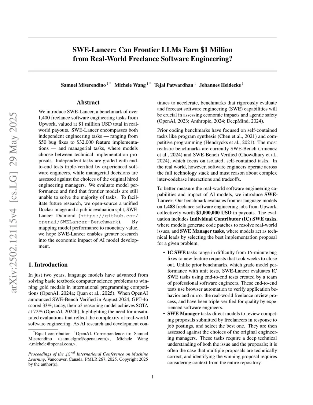 We introduce SWE-Lancer, a benchmark of over 1,400 freelance software engineering tasks from Upwork, valued at \1 million USD total in real-world payouts. SWE-Lancer encompasses both independent engineering tasks--ranging from \50 bug fixes to \$32,000 feature implementations--and managerial tasks, where models choose between technical implementation proposals. Independent tasks are graded with end-to-end tests triple-verified by experienced software engineers, while managerial decisions are assessed against the choices of the original hired engineering managers. We evaluate model performance and find that frontier models are still unable to solve the majority of tasks. To facilitate future research, we open-source a unified Docker image and a public evaluation split, SWE-Lancer Diamond (this https URL). By mapping model performance to monetary value, we hope SWE-Lancer enables greater research into the economic impact of AI model development.