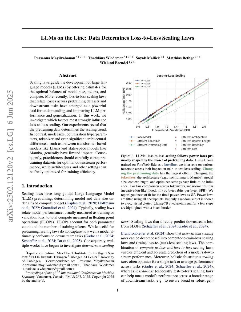 Scaling laws guide the development of large language models (LLMs) by offering estimates for the optimal balance of model size, tokens, and compute. More recently, loss-to-loss scaling laws that relate losses across pretraining datasets and downstream tasks have emerged as a powerful tool for understanding and improving LLM performance. In this work, we investigate which factors most strongly influence loss-to-loss scaling. Our experiments reveal that the pretraining data and tokenizer determine the scaling trend. In contrast, model size, optimization hyperparameters, and even significant architectural differences, such as between transformer-based models like Llama and state-space models like Mamba, have limited impact. Consequently, practitioners should carefully curate suitable pretraining datasets for optimal downstream performance, while architectures and other settings can be freely optimized for training efficiency.