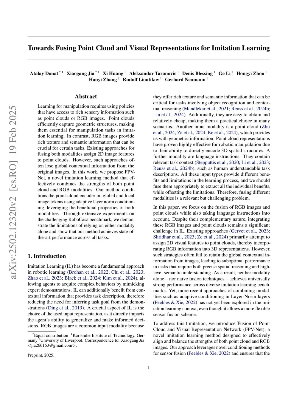Learning for manipulation requires using policies that have access to rich sensory information such as point clouds or RGB images. Point clouds efficiently capture geometric structures, making them essential for manipulation tasks in imitation learning. In contrast, RGB images provide rich texture and semantic information that can be crucial for certain tasks. Existing approaches for fusing both modalities assign 2D image features to point clouds. However, such approaches often lose global contextual information from the original images. In this work, we propose FPV-Net, a novel imitation learning method that effectively combines the strengths of both point cloud and RGB modalities. Our method conditions the point-cloud encoder on global and local image tokens using adaptive layer norm conditioning, leveraging the beneficial properties of both modalities. Through extensive experiments on the challenging RoboCasa benchmark, we demonstrate the limitations of relying on either modality alone and show that our method achieves state-of-the-art performance across all tasks.