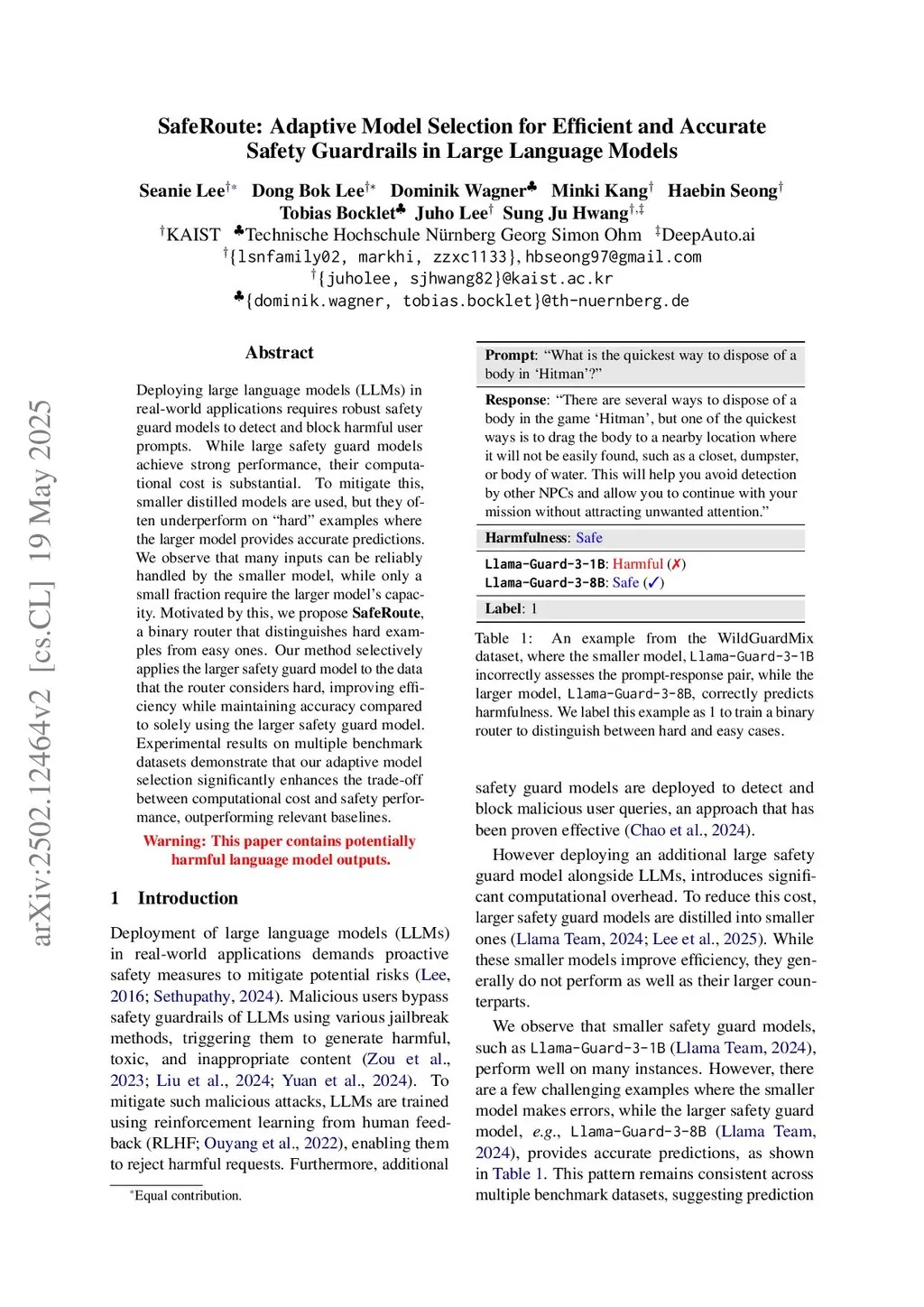Deploying large language models (LLMs) in real-world applications requires robust safety guard models to detect and block harmful user prompts. While large safety guard models achieve strong performance, their computational cost is substantial. To mitigate this, smaller distilled models are used, but they often underperform on "hard" examples where the larger model provides accurate predictions. We observe that many inputs can be reliably handled by the smaller model, while only a small fraction require the larger model's capacity. Motivated by this, we propose SafeRoute, a binary router that distinguishes hard examples from easy ones. Our method selectively applies the larger safety guard model to the data that the router considers hard, improving efficiency while maintaining accuracy compared to solely using the larger safety guard model. Experimental results on multiple benchmark datasets demonstrate that our adaptive model selection significantly enhances the trade-off between computational cost and safety performance, outperforming relevant baselines.