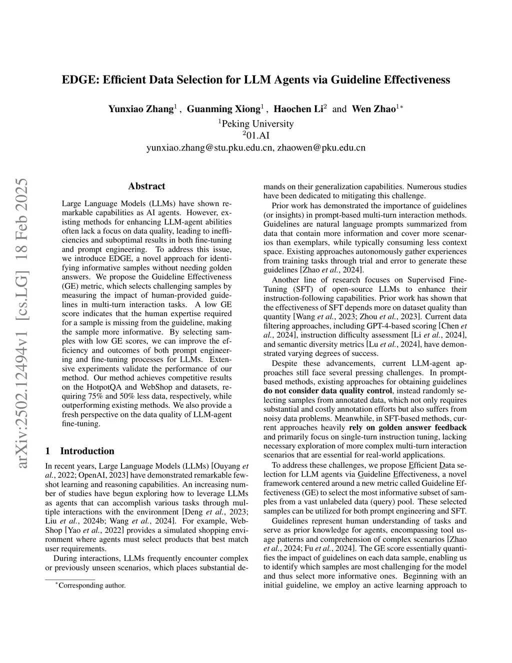 Large Language Models (LLMs) have shown remarkable capabilities as AI agents. However, existing methods for enhancing LLM-agent abilities often lack a focus on data quality, leading to inefficiencies and suboptimal results in both fine-tuning and prompt engineering. To address this issue, we introduce EDGE, a novel approach for identifying informative samples without needing golden answers. We propose the Guideline Effectiveness (GE) metric, which selects challenging samples by measuring the impact of human-provided guidelines in multi-turn interaction tasks. A low GE score indicates that the human expertise required for a sample is missing from the guideline, making the sample more informative. By selecting samples with low GE scores, we can improve the efficiency and outcomes of both prompt engineering and fine-tuning processes for LLMs. Extensive experiments validate the performance of our method. Our method achieves competitive results on the HotpotQA and WebShop and datasets, requiring 75\% and 50\% less data, respectively, while outperforming existing methods. We also provide a fresh perspective on the data quality of LLM-agent fine-tuning.