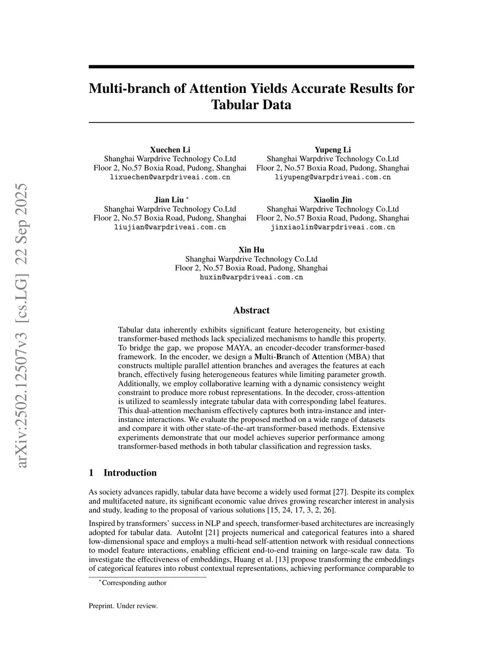 Tabular data inherently exhibits significant feature heterogeneity, but existing transformer-based methods lack specialized mechanisms to handle this property. To bridge the gap, we propose MAYA, an encoder-decoder transformer-based framework. In the encoder, we design a Multi-Branch of Attention (MBA) that constructs multiple parallel attention branches and averages the features at each branch, effectively fusing heterogeneous features while limiting parameter growth. Additionally, we employ collaborative learning with a dynamic consistency weight constraint to produce more robust representations. In the decoder stage, cross-attention is utilized to seamlessly integrate tabular data with corresponding label features. This dual-attention mechanism effectively captures both intra-instance and inter-instance interactions. We evaluate the proposed method on a wide range of datasets and compare it with other state-of-the-art transformer-based methods. Extensive experiments demonstrate that our model achieves superior performance among transformer-based methods in both tabular classification and regression tasks.