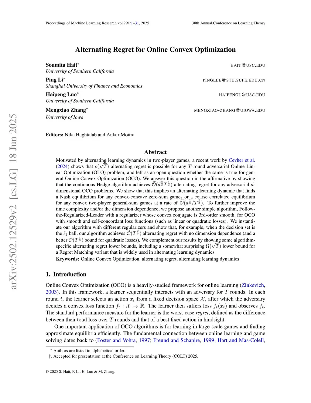 Motivated by alternating learning dynamics in two-player games, a recent work by Cevher et al.(2024) shows that alternating regret is possible for any -round adversarial Online Linear Optimization (OLO) problem, and left as an open question whether the same is true for general Online Convex Optimization (OCO). We answer this question in the affirmative by showing that the continuous Hedge algorithm achieves alternating regret for any adversarial -dimensional OCO problems. We show that this implies an alternating learning dynamic that finds a Nash equilibrium for any convex-concave zero-sum games or a coarse correlated equilibrium for any convex two-player general-sum games at a rate of . To further improve the time complexity and/or the dimension dependence, we propose another simple algorithm, Follow-the-Regularized-Leader with a regularizer whose convex conjugate is 3rd-order smooth, for OCO with smooth and self-concordant loss functions (such as linear or quadratic losses). We instantiate our algorithm with different regularizers and show that, for example, when the decision set is the ball, our algorithm achieves alternating regret with no dimension dependence (and a better bound for quadratic losses). We complement our results by showing some algorithm-specific alternating regret lower bounds, including a somewhat surprising lower bound for a Regret Matching variant that is widely used in alternating learning dynamics.