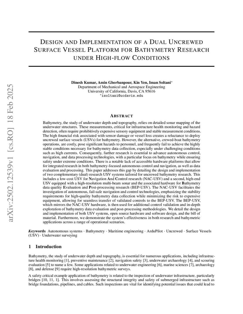 Bathymetry, the study of underwater topography, relies on sonar mapping of submerged structures. These measurements, critical for infrastructure health monitoring, often require expensive instrumentation. The high financial risk associated with sensor damage or vessel loss creates a reluctance to deploy uncrewed surface vessels (USVs) for bathymetry. However, the crewed-boat bathymetry operations, are costly, pose hazards to personnel, and frequently fail to achieve the stable conditions necessary for bathymetry data collection, especially under high currents. Further research is essential to advance autonomous control, navigation, and data processing technologies, with a particular focus on bathymetry. There is a notable lack of accessible hardware platforms that allow for integrated research in both bathymetry-focused autonomous control and navigation, as well as data evaluation and processing. This paper addresses this gap through the design and implementation of two complementary USV systems tailored for uncrewed bathymetry research. This includes a low-cost USV for Navigation And Control research (NAC-USV) and a second, high-end USV equipped with a high-resolution multi-beam sonar and the associated hardware for Bathymetry data quality Evaluation and Post-processing research (BEP-USV). The NAC-USV facilitates the investigation of autonomous, fail-safe navigation and control, emphasizing the stability requirements for high-quality bathymetry data collection while minimizing the risk to equipment. The BEP-USV, which mirrors the NAC-USV hardware, is then used for additional control validation and in-depth exploration of bathymetry data evaluation and post-processing methodologies. We detail the design and implementation of both systems, and open source the design. Furthermore, we demonstrate the system's effectiveness in a range of operational scenarios.
