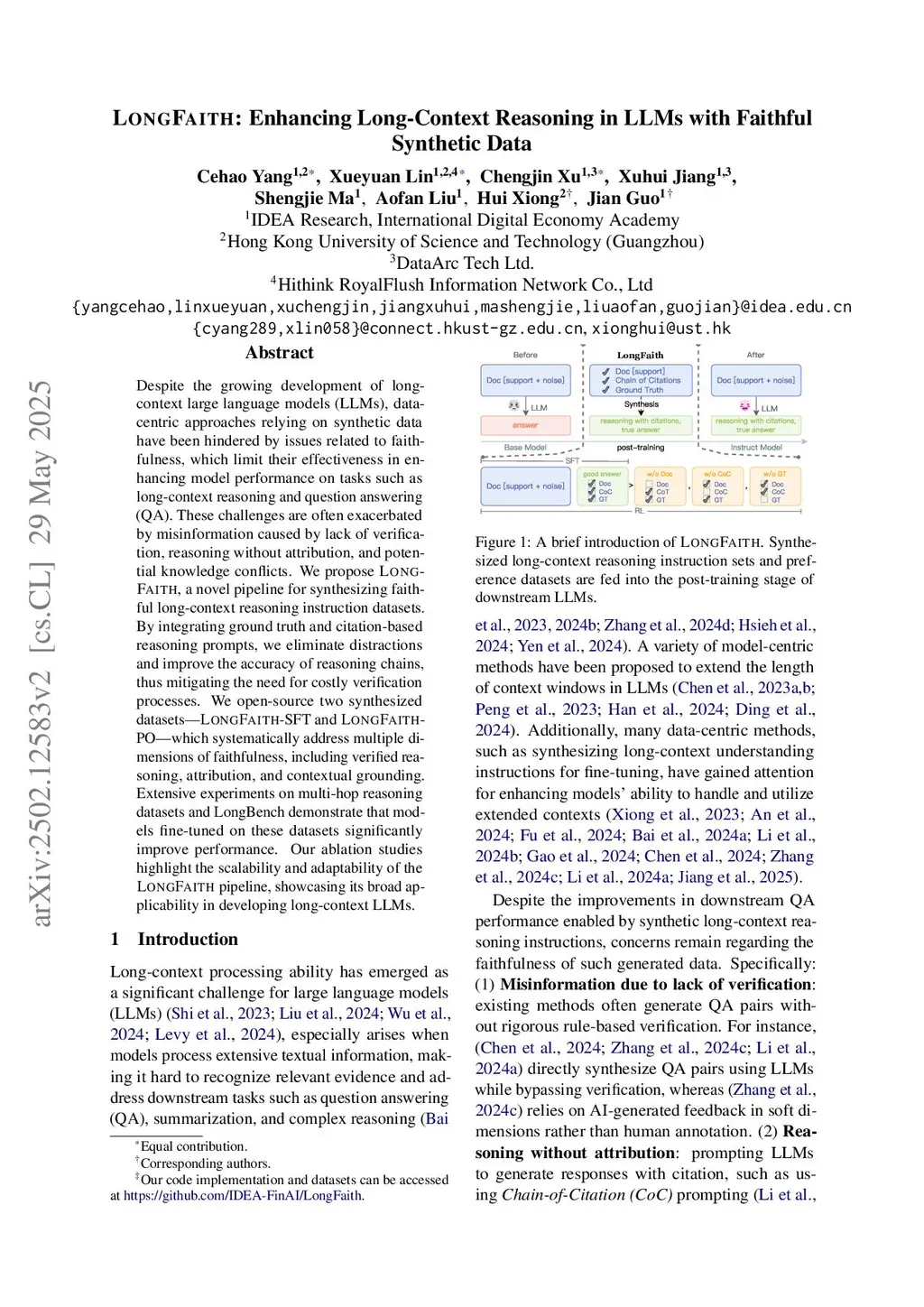 Despite the growing development of long-context large language models (LLMs), data-centric approaches relying on synthetic data have been hindered by issues related to faithfulness, which limit their effectiveness in enhancing model performance on tasks such as long-context reasoning and question answering (QA). These challenges are often exacerbated by misinformation caused by lack of verification, reasoning without attribution, and potential knowledge conflicts. We propose LongFaith, a novel pipeline for synthesizing faithful long-context reasoning instruction datasets. By integrating ground truth and citation-based reasoning prompts, we eliminate distractions and improve the accuracy of reasoning chains, thus mitigating the need for costly verification processes. We open-source two synthesized datasets, LongFaith-SFT and LongFaith-PO, which systematically address multiple dimensions of faithfulness, including verified reasoning, attribution, and contextual grounding. Extensive experiments on multi-hop reasoning datasets and LongBench demonstrate that models fine-tuned on these datasets significantly improve performance. Our ablation studies highlight the scalability and adaptability of the LongFaith pipeline, showcasing its broad applicability in developing long-context LLMs.
