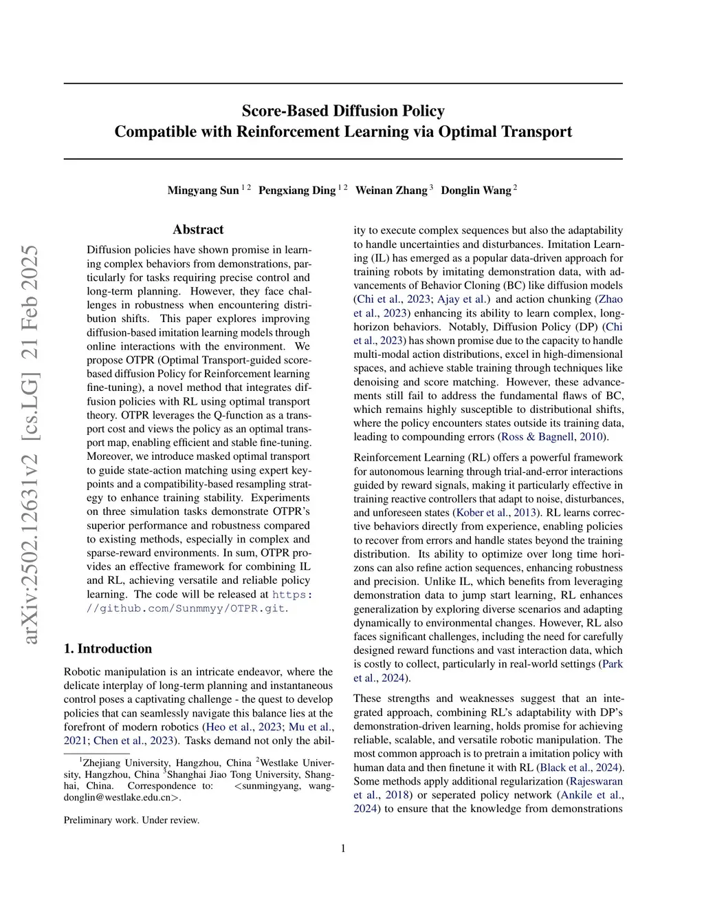 Diffusion policies have shown promise in learning complex behaviors from demonstrations, particularly for tasks requiring precise control and long-term planning. However, they face challenges in robustness when encountering distribution shifts. This paper explores improving diffusion-based imitation learning models through online interactions with the environment. We propose OTPR (Optimal Transport-guided score-based diffusion Policy for Reinforcement learning fine-tuning), a novel method that integrates diffusion policies with RL using optimal transport theory. OTPR leverages the Q-function as a transport cost and views the policy as an optimal transport map, enabling efficient and stable fine-tuning. Moreover, we introduce masked optimal transport to guide state-action matching using expert keypoints and a compatibility-based resampling strategy to enhance training stability. Experiments on three simulation tasks demonstrate OTPR's superior performance and robustness compared to existing methods, especially in complex and sparse-reward environments. In sum, OTPR provides an effective framework for combining IL and RL, achieving versatile and reliable policy learning. The code will be released atthis https URL.