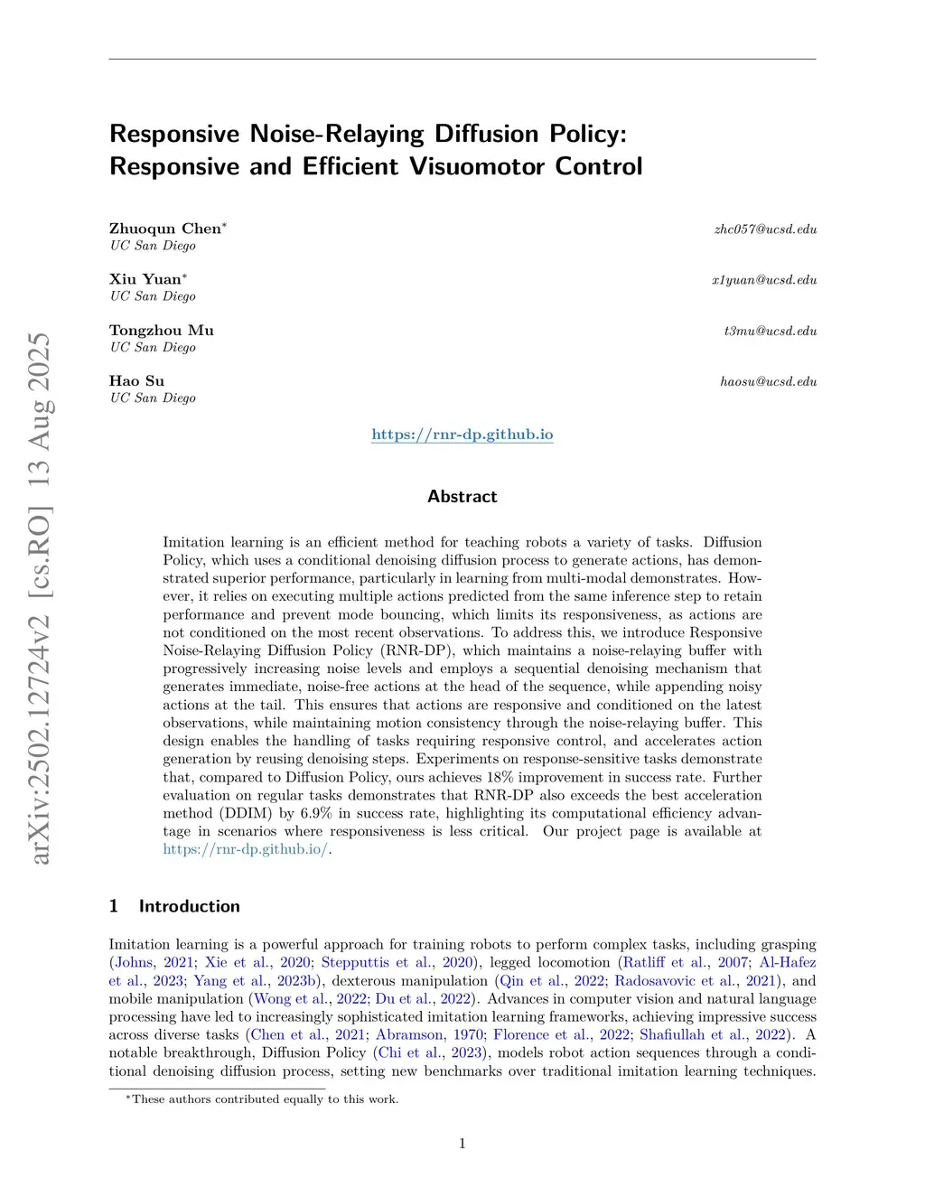 Responsive Noise-Relaying Diffusion Policy: Responsive and Efficient Visuomotor Control