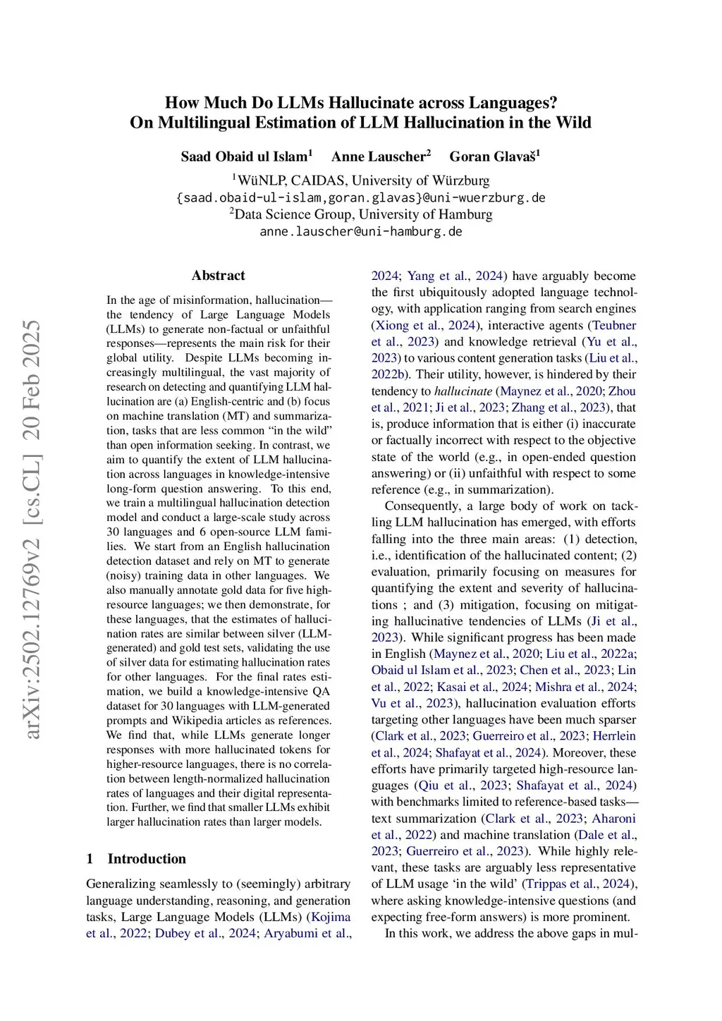 In the age of misinformation, hallucination - the tendency of Large Language Models (LLMs) to generate non-factual or unfaithful responses - represents the main risk for their global utility. Despite LLMs becoming increasingly multilingual, the vast majority of research on detecting and quantifying LLM hallucination are (a) English-centric and (b) focus on machine translation (MT) and summarization, tasks that are less common in realistic settings than open information seeking. In contrast, we aim to quantify the extent of LLM hallucination across languages in knowledge-intensive long-form question answering (LFQA). To this end, we train a multilingual hallucination detection model and conduct a large-scale study across 30 languages and 6 open-source LLM families. We start from an English hallucination detection dataset and rely on MT to translate-train a detection model. We also manually annotate gold data for five high-resource languages; we then demonstrate, for these languages, that the estimates of hallucination rates are similar between silver (LLM-generated) and gold test sets, validating the use of silver data for estimating hallucination rates for other languages. For the final rates estimation, we build open-domain QA dataset for 30 languages with LLM-generated prompts and Wikipedia articles as references. Our analysis shows that LLMs, in absolute terms, hallucinate more tokens in high-resource languages due to longer responses, but that the actual hallucination rates (i.e., normalized for length) seems uncorrelated with the sizes of languages' digital footprints. We also find that smaller LLMs hallucinate more, and significantly, LLMs with broader language support display higher hallucination rates.