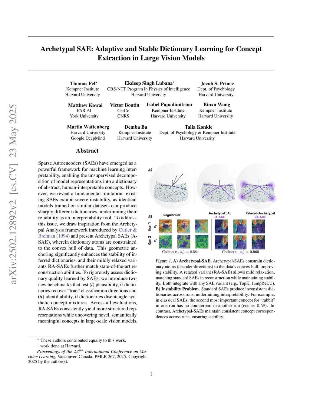 Sparse Autoencoders (SAEs) have emerged as a powerful framework for machine learning interpretability, enabling the unsupervised decomposition of model representations into a dictionary of abstract, human-interpretable concepts. However, we reveal a fundamental limitation: existing SAEs exhibit severe instability, as identical models trained on similar datasets can produce sharply different dictionaries, undermining their reliability as an interpretability tool. To address this issue, we draw inspiration from the Archetypal Analysis framework introduced by Cutler & Breiman (1994) and present Archetypal SAEs (A-SAE), wherein dictionary atoms are constrained to the convex hull of data. This geometric anchoring significantly enhances the stability of inferred dictionaries, and their mildly relaxed variants RA-SAEs further match state-of-the-art reconstruction abilities. To rigorously assess dictionary quality learned by SAEs, we introduce two new benchmarks that test (i) plausibility, if dictionaries recover "true" classification directions and (ii) identifiability, if dictionaries disentangle synthetic concept mixtures. Across all evaluations, RA-SAEs consistently yield more structured representations while uncovering novel, semantically meaningful concepts in large-scale vision models.