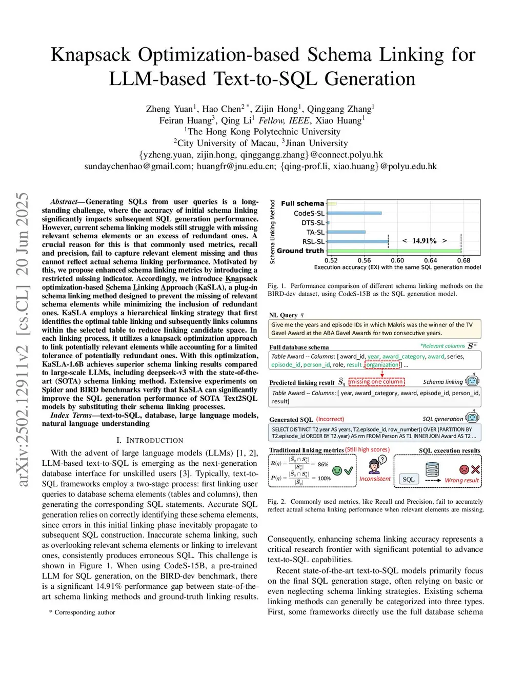 Generating SQLs from user queries is a long-standing challenge, where the accuracy of initial schema linking significantly impacts subsequent SQL generation performance. However, current schema linking models still struggle with missing relevant schema elements or an excess of redundant ones. A crucial reason for this is that commonly used metrics, recall and precision, fail to capture relevant element missing and thus cannot reflect actual schema linking performance. Motivated by this, we propose enhanced schema linking metrics by introducing a restricted missing indicator. Accordingly, we introduce Knapsack optimization-based Schema Linking Approach (KaSLA), a plug-in schema linking method designed to prevent the missing of relevant schema elements while minimizing the inclusion of redundant ones. KaSLA employs a hierarchical linking strategy that first identifies the optimal table linking and subsequently links columns within the selected table to reduce linking candidate space. In each linking process, it utilizes a knapsack optimization approach to link potentially relevant elements while accounting for a limited tolerance of potentially redundant ones. With this optimization, KaSLA-1.6B achieves superior schema linking results compared to large-scale LLMs, including deepseek-v3 with the state-of-the-art (SOTA) schema linking method. Extensive experiments on Spider and BIRD benchmarks verify that KaSLA can significantly improve the SQL generation performance of SOTA Text2SQL models by substituting their schema linking processes.