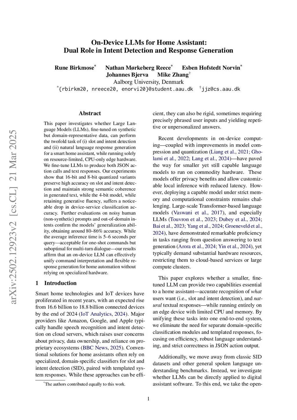 This paper investigates whether Large Language Models (LLMs), fine-tuned on synthetic but domain-representative data, can perform the twofold task of (i) slot and intent detection and (ii) natural language response generation for a smart home assistant, while running solely on resource-limited, CPU-only edge hardware. We fine-tune LLMs to produce both JSON action calls and text responses. Our experiments show that 16-bit and 8-bit quantized variants preserve high accuracy on slot and intent detection and maintain strong semantic coherence in generated text, while the 4-bit model, while retaining generative fluency, suffers a noticeable drop in device-service classification accuracy. Further evaluations on noisy human (non-synthetic) prompts and out-of-domain intents confirm the models' generalization ability, obtaining around 80--86\% accuracy. While the average inference time is 5--6 seconds per query -- acceptable for one-shot commands but suboptimal for multi-turn dialogue -- our results affirm that an on-device LLM can effectively unify command interpretation and flexible response generation for home automation without relying on specialized hardware.