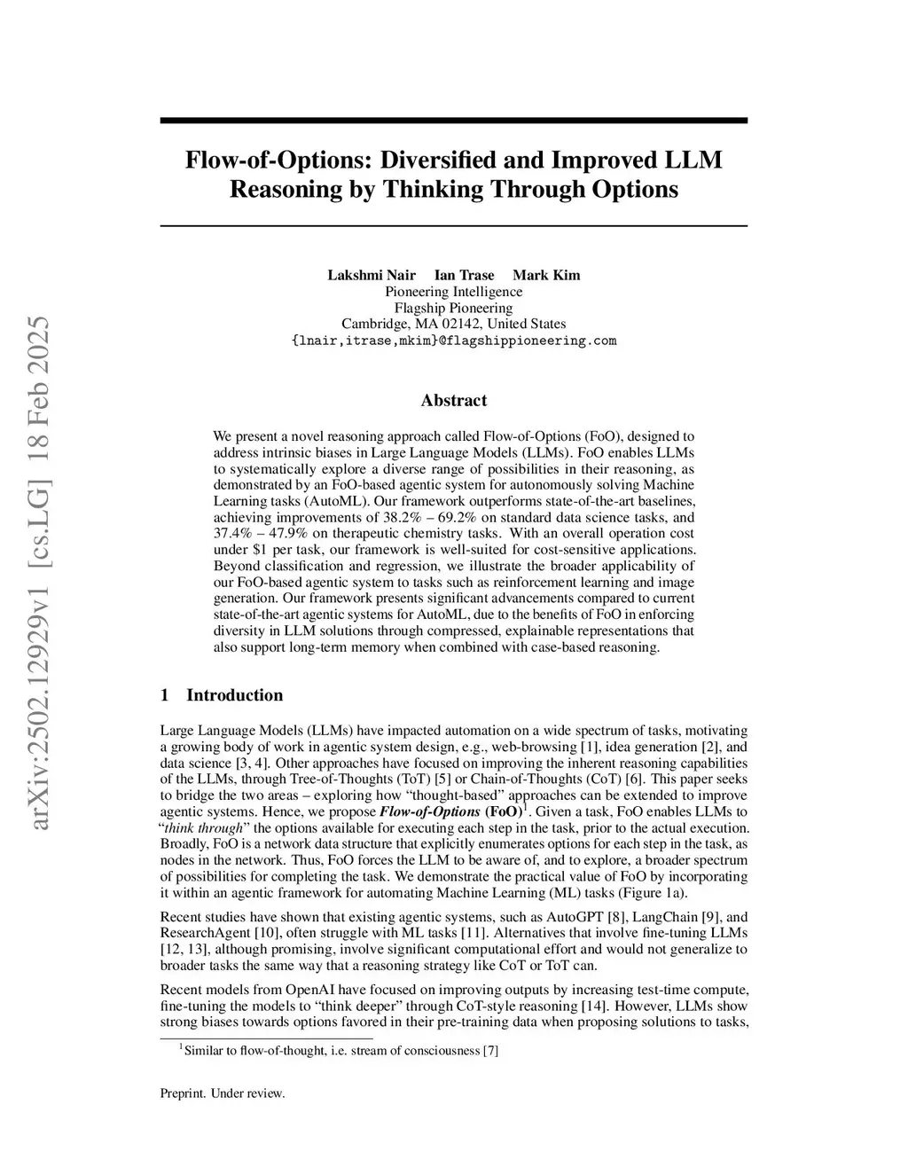 We present a novel reasoning approach called Flow-of-Options (FoO), designed to address intrinsic biases in Large Language Models (LLMs). Flow-of-Options enables LLMs to systematically explore a diverse range of possibilities in their reasoning, as demonstrated by an FoO-based agentic framework developed for autonomously solving Machine Learning (ML) tasks. FoO enforces diversity in LLM solutions through compressed and interpretable task representations, resulting in improvements of 38.2% - 69.2% on standard data science tasks, and 37.4% - 47.9% on therapeutic chemistry tasks, as compared to state-of-the-art baselines. With an overall operation cost under $1 per task, our framework is well-suited for cost-sensitive applications. Going beyond tabular classification and regression, we show the broader applicability of our FoO-based agentic system to tasks such as reinforcement learning and image generation. Our code is open-sourced at:this https URL.