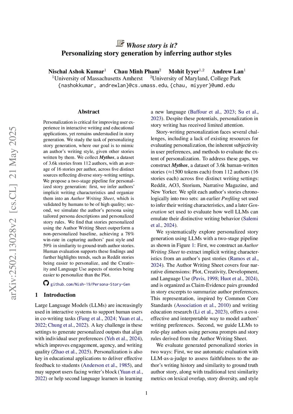 Personalization is critical for improving user experience in interactive writing and educational applications, yet remains understudied in story generation. We study the task of personalizing story generation, where our goal is to mimic an author's writing style, given other stories written by them. We collect Mythos, a dataset of 3.6k stories from 112 authors, with an average of 16 stories per author, across five distinct sources reflecting diverse story-writing settings. We propose a two-stage pipeline for personalized story generation: first, we infer authors' implicit writing characteristics and organize them into an Author Writing Sheet, which is validated by humans to be of high quality; second, we simulate the author's persona using tailored persona descriptions and personalized story rules. We find that stories personalized using the Author Writing Sheet outperform a non-personalized baseline, achieving a 78% win-rate in capturing authors' past style and 59% in similarity to ground-truth author stories. Human evaluation supports these findings and further highlights trends, such as Reddit stories being easier to personalize, and the Creativity and Language Use aspects of stories being easier to personalize than the Plot.