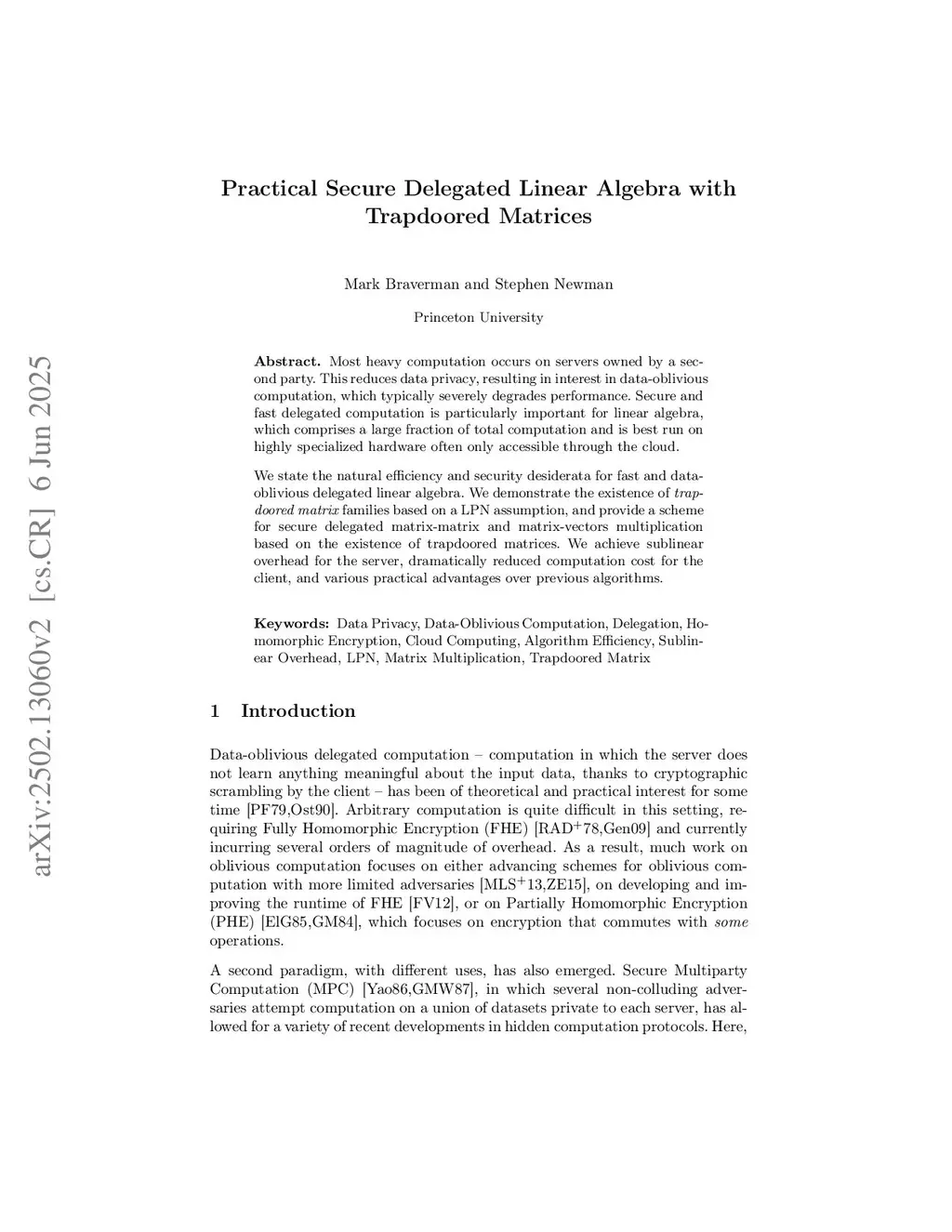 Most heavy computation occurs on servers owned by a second party. This reduces data privacy, resulting in interest in data-oblivious computation, which typically severely degrades performance. Secure and fast delegated computation is particularly important for linear algebra, which comprises a large fraction of total computation and is best run on highly specialized hardware often accessible only through the cloud.We state the natural efficiency and security desiderata for fast and data-oblivious delegated linear algebra. We demonstrate the existence of \textit{Trapdoored-Matrix} families based on an LPN assumption, and provide a scheme for secure delegated matrix-matrix and matrix-vector multiplication based on the existence of trapdoored matrices. We achieve sublinear overhead for the server, dramatically reduced computation for the client, and various practical advantages over previous protocols.