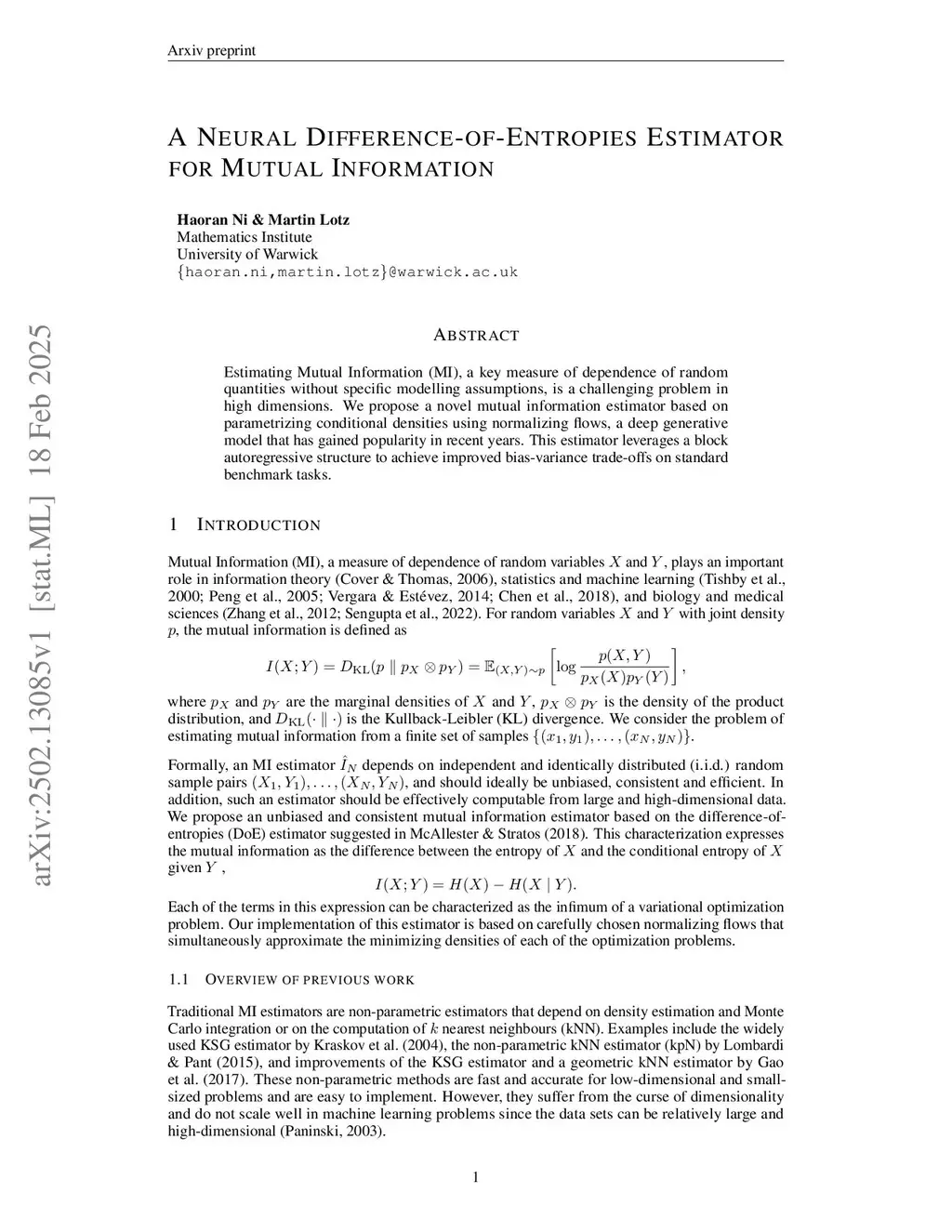 A Neural Difference-of-Entropies Estimator for Mutual Information