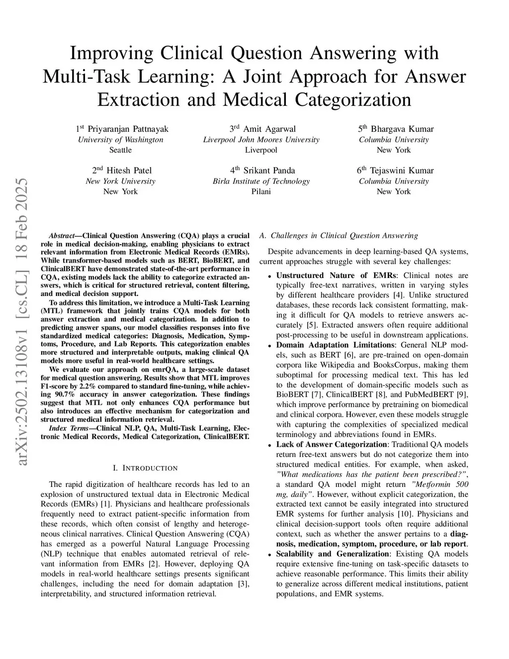 Clinical Question Answering (CQA) plays a crucial role in medical decision-making, enabling physicians to extract relevant information from Electronic Medical Records (EMRs). While transformer-based models such as BERT, BioBERT, and ClinicalBERT have demonstrated state-of-the-art performance in CQA, existing models lack the ability to categorize extracted answers, which is critical for structured retrieval, content filtering, and medical decision support.To address this limitation, we introduce a Multi-Task Learning (MTL) framework that jointly trains CQA models for both answer extraction and medical categorization. In addition to predicting answer spans, our model classifies responses into five standardized medical categories: Diagnosis, Medication, Symptoms, Procedure, and Lab Reports. This categorization enables more structured and interpretable outputs, making clinical QA models more useful in real-world healthcare settings.We evaluate our approach on emrQA, a large-scale dataset for medical question answering. Results show that MTL improves F1-score by 2.2% compared to standard fine-tuning, while achieving 90.7% accuracy in answer categorization. These findings suggest that MTL not only enhances CQA performance but also introduces an effective mechanism for categorization and structured medical information retrieval.