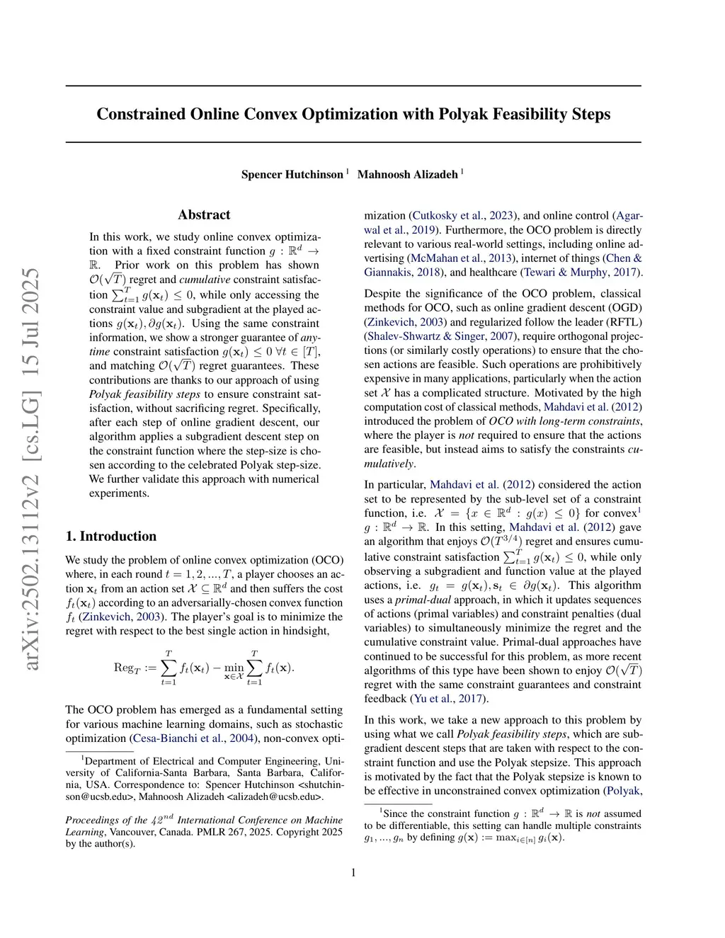 In this work, we study online convex optimization with a fixed constraint function . Prior work on this problem has shown regret and cumulative constraint satisfaction , while only accessing the constraint value and subgradient at the played actions . Using the same constraint information, we show a stronger guarantee of anytime constraint satisfaction , and matching regret guarantees. These contributions are thanks to our approach of using Polyak feasibility steps to ensure constraint satisfaction, without sacrificing regret. Specifically, after each step of online gradient descent, our algorithm applies a subgradient descent step on the constraint function where the step-size is chosen according to the celebrated Polyak step-size. We further validate this approach with numerical experiments.