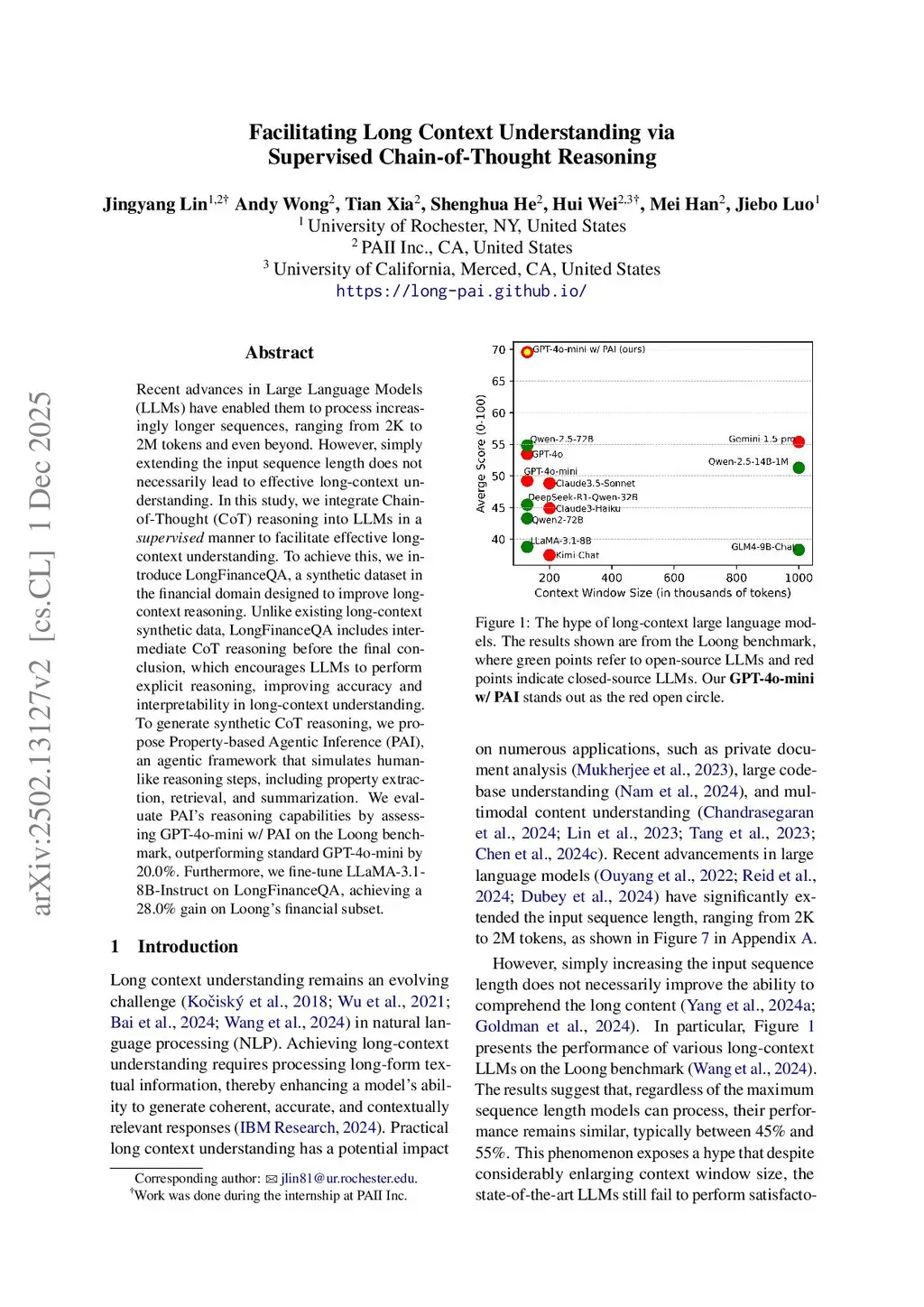 Recent advances in Large Language Models (LLMs) have enabled them to process increasingly longer sequences, ranging from 2K to 2M tokens and even beyond. However, simply extending the input sequence length does not necessarily lead to effective long-context understanding. In this study, we integrate Chain-of-Thought (CoT) reasoning into LLMs in a supervised manner to facilitate effective long-context understanding. To achieve this, we introduce LongFinanceQA, a synthetic dataset in the financial domain designed to improve long-context reasoning. Unlike existing long-context synthetic data, LongFinanceQA includes intermediate CoT reasoning before the final conclusion, which encourages LLMs to perform explicit reasoning, improving accuracy and interpretability in long-context understanding. To generate synthetic CoT reasoning, we propose Property-based Agentic Inference (PAI), an agentic framework that simulates human-like reasoning steps, including property extraction, retrieval, and summarization. We evaluate PAI's reasoning capabilities by assessing GPT-4o-mini w/ PAI on the Loong benchmark, outperforming standard GPT-4o-mini by 20.0%. Furthermore, we fine-tune LLaMA-3.1-8B-Instruct on LongFinanceQA, achieving a 28.0% gain on Loong's financial subset.