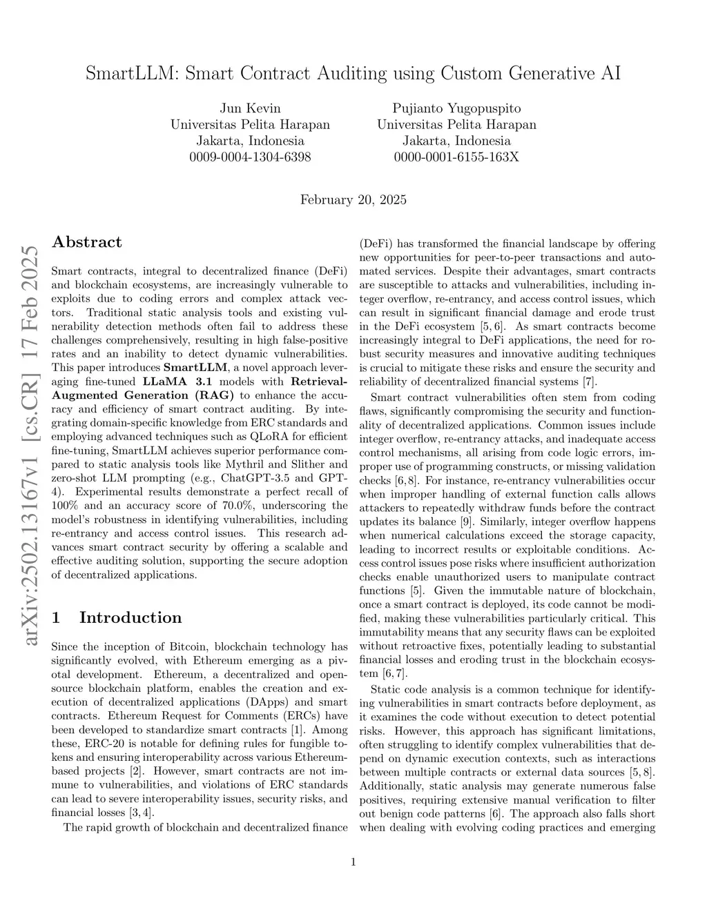 Smart contracts are essential to decentralized finance (DeFi) and blockchain ecosystems but are increasingly vulnerable to exploits due to coding errors and complex attack vectors. Traditional static analysis tools and existing vulnerability detection methods often fail to address these challenges comprehensively, leading to high false-positive rates and an inability to detect dynamic vulnerabilities. This paper introduces SmartLLM, a novel approach leveraging fine-tuned LLaMA 3.1 models with Retrieval-Augmented Generation (RAG) to enhance the accuracy and efficiency of smart contract auditing. By integrating domain-specific knowledge from ERC standards and employing advanced techniques such as QLoRA for efficient fine-tuning, SmartLLM achieves superior performance compared to static analysis tools like Mythril and Slither, as well as zero-shot large language model (LLM) prompting methods such as GPT-3.5 and GPT-4. Experimental results demonstrate a perfect recall of 100% and an accuracy score of 70%, highlighting the model's robustness in identifying vulnerabilities, including reentrancy and access control issues. This research advances smart contract security by offering a scalable and effective auditing solution, supporting the secure adoption of decentralized applications.