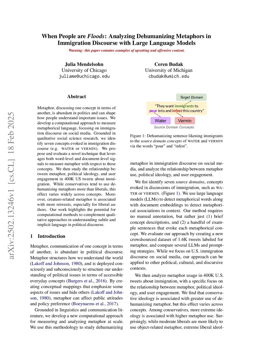 When People are Floods: Analyzing Dehumanizing Metaphors in Immigration Discourse with Large Language Models