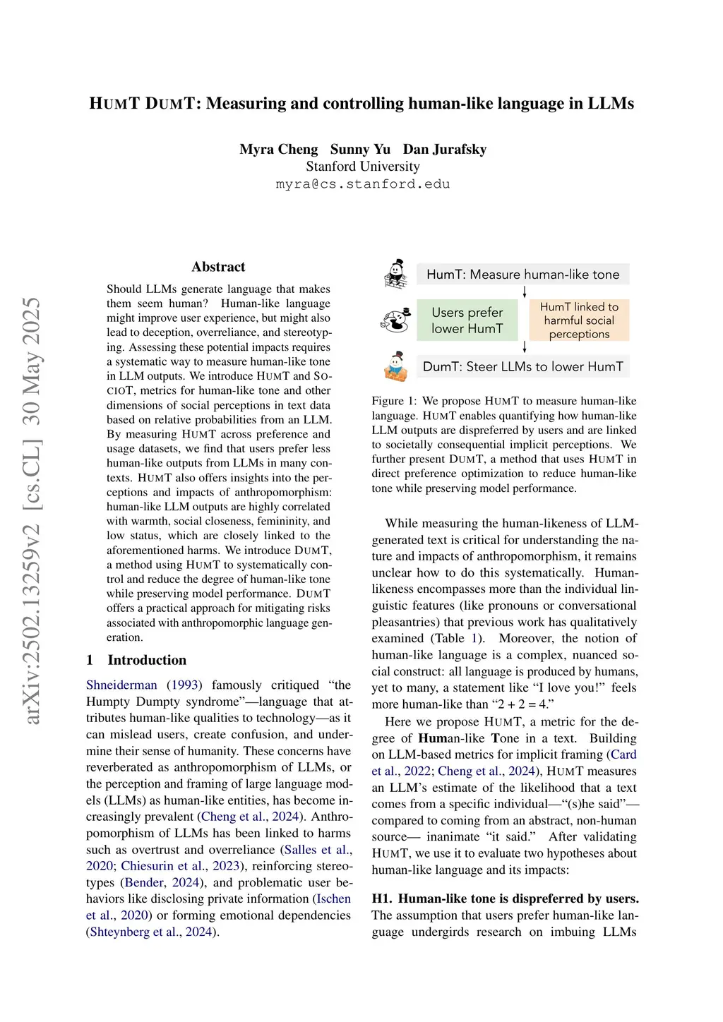 Should LLMs generate language that makes them seem human? Human-like language might improve user experience, but might also lead to deception, overreliance, and stereotyping. Assessing these potential impacts requires a systematic way to measure human-like tone in LLM outputs. We introduce HumT and SocioT, metrics for human-like tone and other dimensions of social perceptions in text data based on relative probabilities from an LLM. By measuring HumT across preference and usage datasets, we find that users prefer less human-like outputs from LLMs in many contexts. HumT also offers insights into the perceptions and impacts of anthropomorphism: human-like LLM outputs are highly correlated with warmth, social closeness, femininity, and low status, which are closely linked to the aforementioned harms. We introduce DumT, a method using HumT to systematically control and reduce the degree of human-like tone while preserving model performance. DumT offers a practical approach for mitigating risks associated with anthropomorphic language generation.